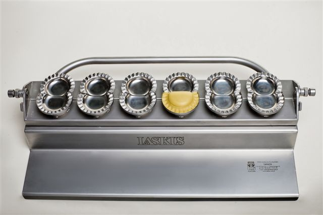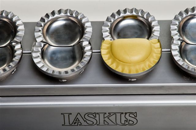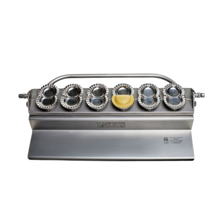Mașină de găluște manuală de la Hendi, proiectat pentru prepararea ușoară a până la 5 găluște în același timp. Carcasa mașinii de făcut găluște este fabricată din oțel inoxidabil cu finisaj periat. Mâner de presare montat pe întreaga lungime a formei pentru a asigura o presiune uniformă pe matriță și lipirea precisă a găluștelor. Mânerul este fabricat din aluminiu. Balamalele care leagă baza de partea mobilă sunt fabricate din oțel inoxidabil. Distanțier din teflon între cele 2 părți pentru o funcționare lină fără frecare. Suprafața de lucru a fost finisată cu un strat antiaderent, ceea ce face mult mai ușoară îndepărtarea găluștelor lipite. Există 4 picioare antiderapante pe partea inferioară pentru a preveni alunecarea unității în timpul funcționării.