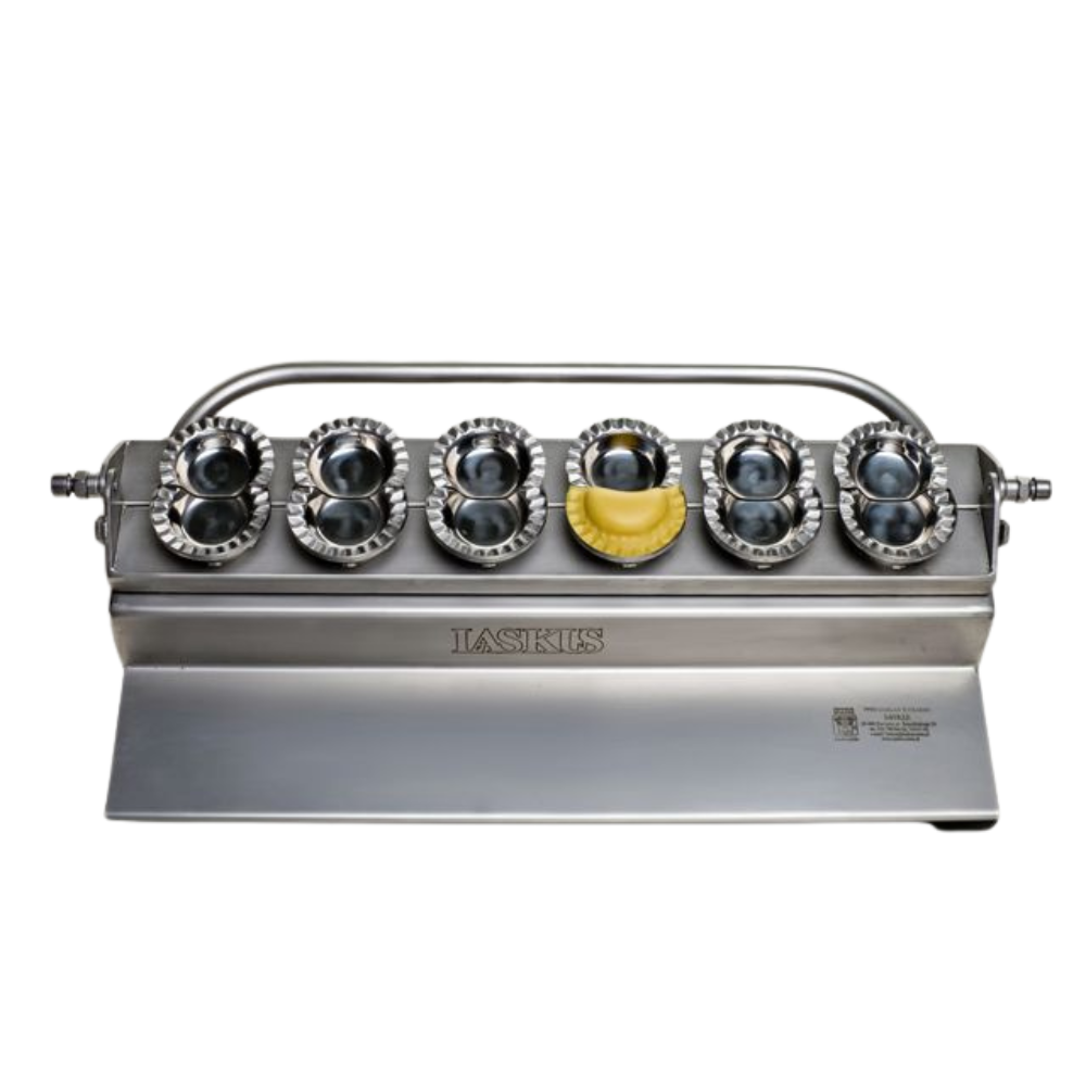 Mașină de găluște manuală de la Hendi, proiectat pentru prepararea ușoară a până la 5 găluște în același timp. Carcasa mașinii de făcut găluște este fabricată din oțel inoxidabil cu finisaj periat. Mâner de presare montat pe întreaga lungime a formei pentru a asigura o presiune uniformă pe matriță și lipirea precisă a găluștelor. Mânerul este fabricat din aluminiu. Balamalele care leagă baza de partea mobilă sunt fabricate din oțel inoxidabil. Distanțier din teflon între cele 2 părți pentru o funcționare lină fără frecare. Suprafața de lucru a fost finisată cu un strat antiaderent, ceea ce face mult mai ușoară îndepărtarea găluștelor lipite. Există 4 picioare antiderapante pe partea inferioară pentru a preveni alunecarea unității în timpul funcționării.