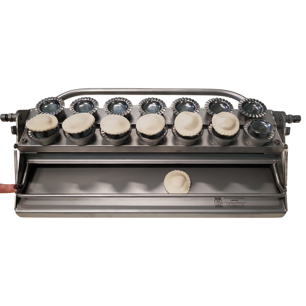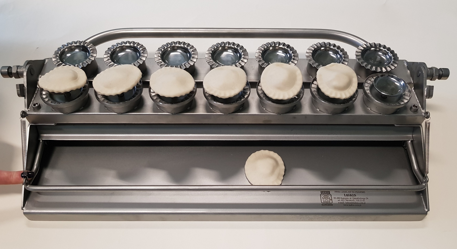 Mașină de găluște manuală de la Hendi, proiectat pentru prepararea ușoară a până la 5 găluște în același timp. Carcasa mașinii de făcut găluște este fabricată din oțel inoxidabil cu finisaj periat. Mâner de presare montat pe întreaga lungime a formei pentru a asigura o presiune uniformă pe matriță și lipirea precisă a găluștelor. Mânerul este fabricat din aluminiu. Balamalele care leagă baza de partea mobilă sunt fabricate din oțel inoxidabil. Distanțier din teflon între cele 2 părți pentru o funcționare lină fără frecare. Suprafața de lucru a fost finisată cu un strat antiaderent, ceea ce face mult mai ușoară îndepărtarea găluștelor lipite. Există 4 picioare antiderapante pe partea inferioară pentru a preveni alunecarea unității în timpul funcționării.