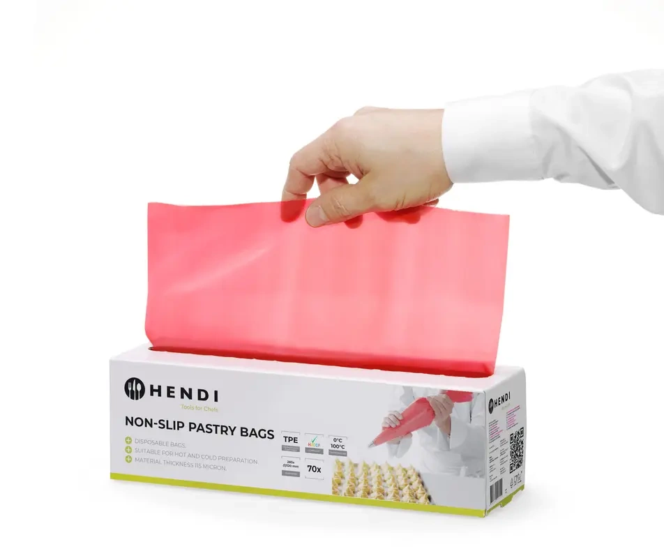 Pungile de șprițat antiderapante HENDI 557150 sunt un instrument profesional destinat cofetarilor, brutarilor și persoanelor care lucrează în domeniul gastronomiei. Se remarcă prin rezistență ridicată și suprafață antiderapantă, ceea ce asigură confort și precizie la lucru atât cu compoziții reci, cât și fierbinți. Produsul este ideal pentru decorarea torturilor, prăjiturilor sau umplerea gogoșilor.