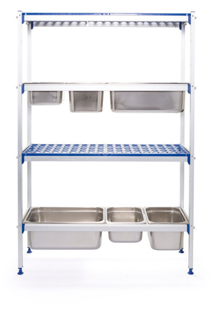 Raft de depozitare din aluminiu pentru recipiente GN. Principalul avantaj al raftului este posibilitatea de a plasa recipientele GN 1/1 direct pe traversele raftului în loc de rafturi. Cadrul raftului este realizat din aluminiu anodizat, iar rafturile sunt fabricate din polipropilenă – pot fi spălate cu ușurință în mașina de spălat vase. Sarcina maximă uniformă este de 150 kg pentru fiecare raft.