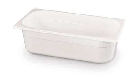 Recipient GN 1/3 cu o adâncime de 10 cm realizat din policarbonat alb. Nu absoarbe mirosuri sau arome. Rezistență la temperaturi între -40 și +99oC.