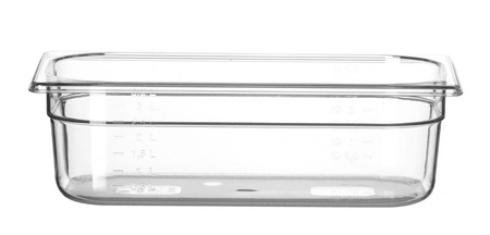 Recipient GN din policarbonat 1/3 cu adâncime de 10 cm. Realizat din policarbonat transparent de înaltă calitate. Nu absoarbe mirosuri sau arome.