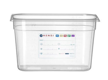 Recipient GN 1/3 HACCP cu adâncime de 20 cm, realizat din polipropilenă transparentă. Etichetă încastrată în material pentru monitorizarea procesului de depozitare. Nu absoarbe mirosuri sau arome.