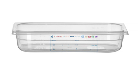 Recipient GN 1/3 HACCP cu adâncimea de 6,5 cm, realizat din polipropilenă transparentă. Eticheta integrată în material permite monitorizarea procesului de depozitare. Nu absoarbe mirosuri sau arome.