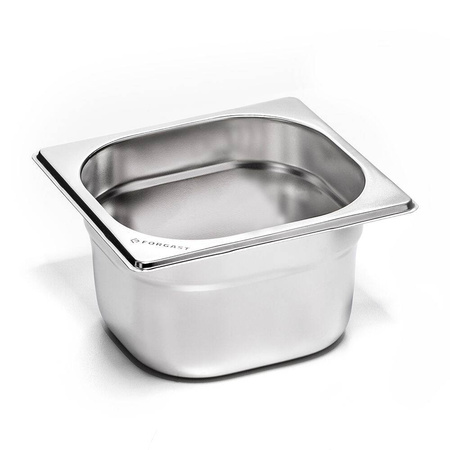 Recipientul GN 1/6 cu adâncime de 15 cm de la Forgast își găsește o gamă largă de aplicații în bucătării profesionale, restaurante, cantine sau companii de catering. Poate fi utilizat pentru depozitarea și transportul alimentelor în recipiente termice, frigidere și congelatoare, precum și pentru încălzirea preparatelor în bain-marie sau pregătirea mâncărurilor în cuptoare combinate. Datorită colțurilor rotunjite, recipientul este ușor de curățat, ceea ce facilitează menținerea unui nivel ridicat de igienă în bucătărie. Setul include doar recipientul – accesoriile suplimentare, precum capacele, se achiziționează separat.