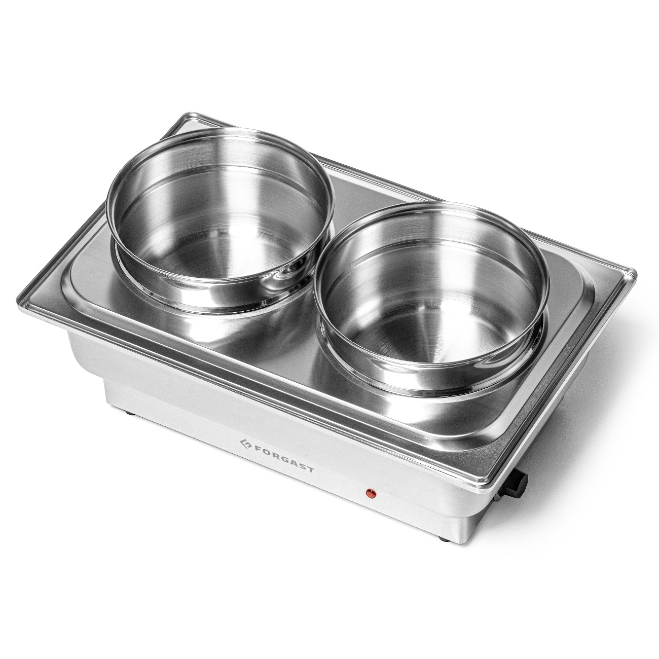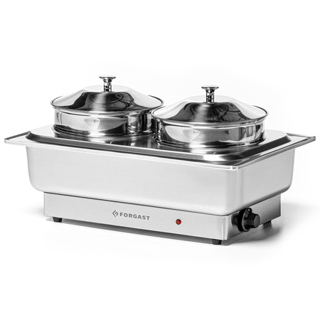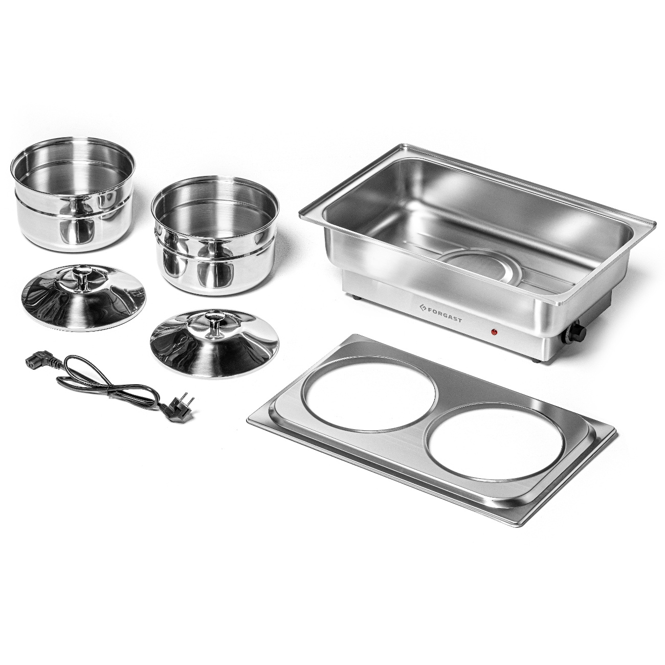 Încălzitorul de masă FORGAST FG03116V1 este realizat din oțel inoxidabil de înaltă calitate, ceea ce îi conferă durabilitate și ușurință la curățare. Setul include două recipiente cu capace, care protejează mâncarea împotriva uscării și pierderii de căldură. Carcasa compactă și designul modern fac ca aparatul să arate excelent în orice interior gastronomic.