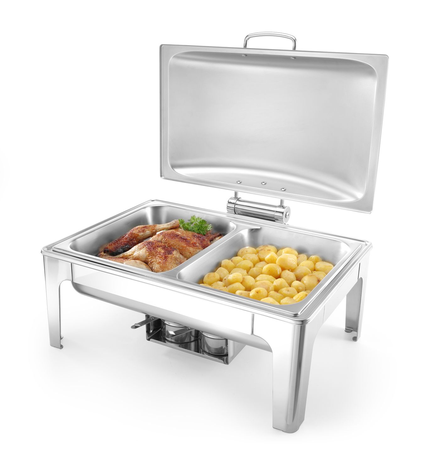 Setul include un recipient detașabil pentru apă, un recipient pentru alimente GN 1/1 cu înălțimea de 6,5 cm și 2 recipiente pentru pastă combustibilă.