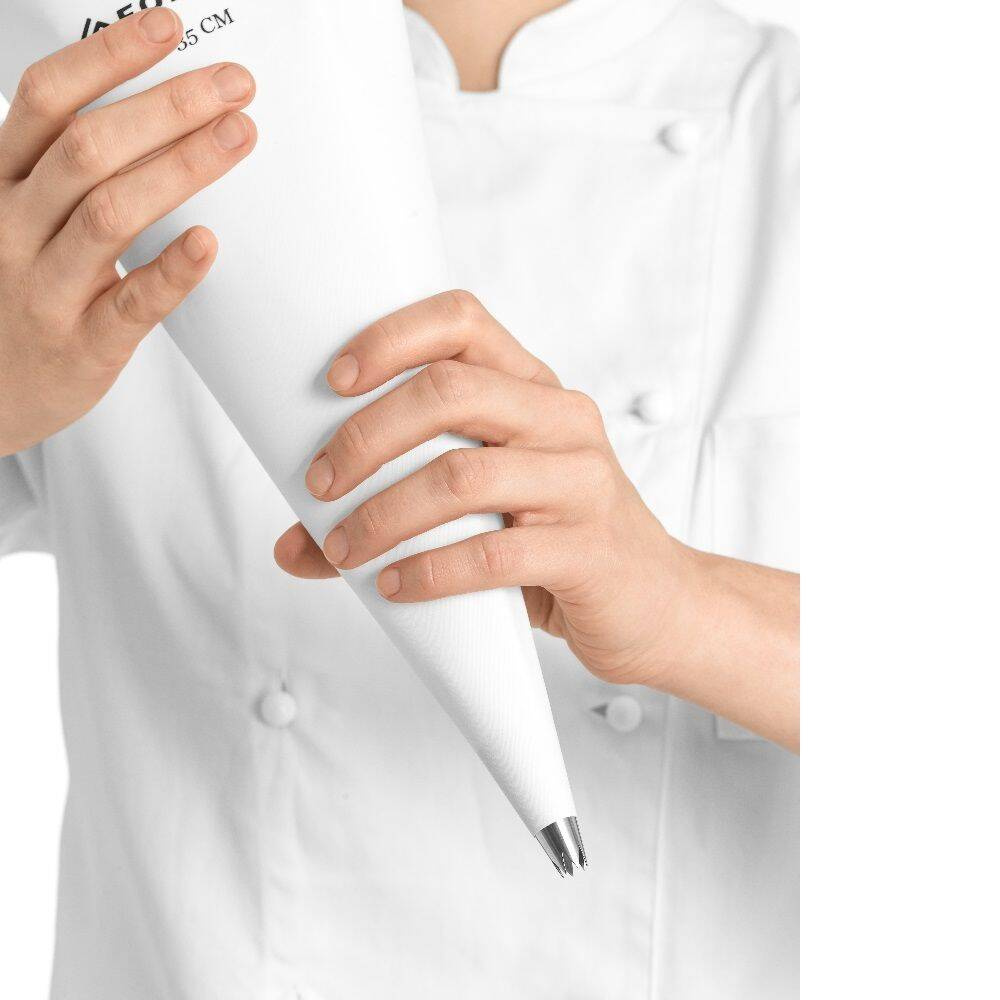Sacul de patiserie din bumbac, lungime 45 cm FORGAST FG11729 este un instrument practic pentru cofetărie, ideal atât pentru cofetăriile profesionale, cât și pentru bucătăriile de acasă. Principalele sale avantaje sunt realizarea din bumbac natural și lungimea convenabilă de 45 cm, care permite dozarea ușoară a cremelor, aluaturilor sau umpluturilor. Ideal pentru decorarea torturilor, prăjiturilor, eclerelor sau a altor deserturi care necesită aplicarea precisă a cremei.