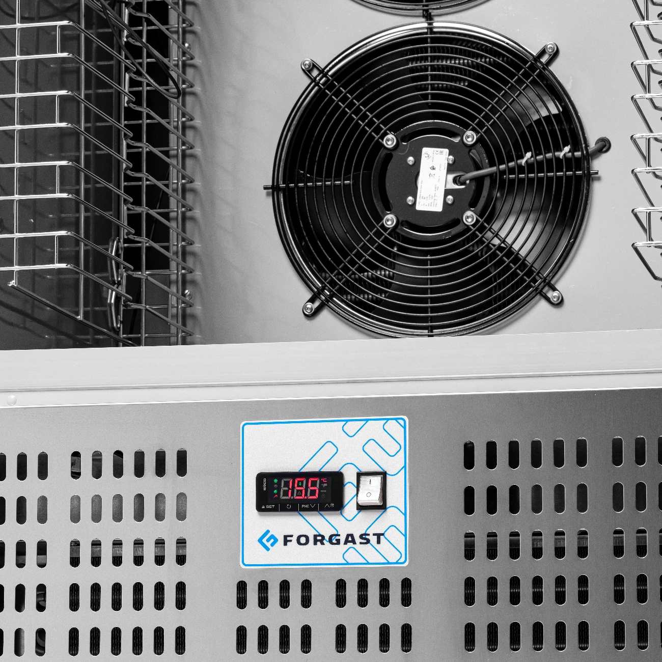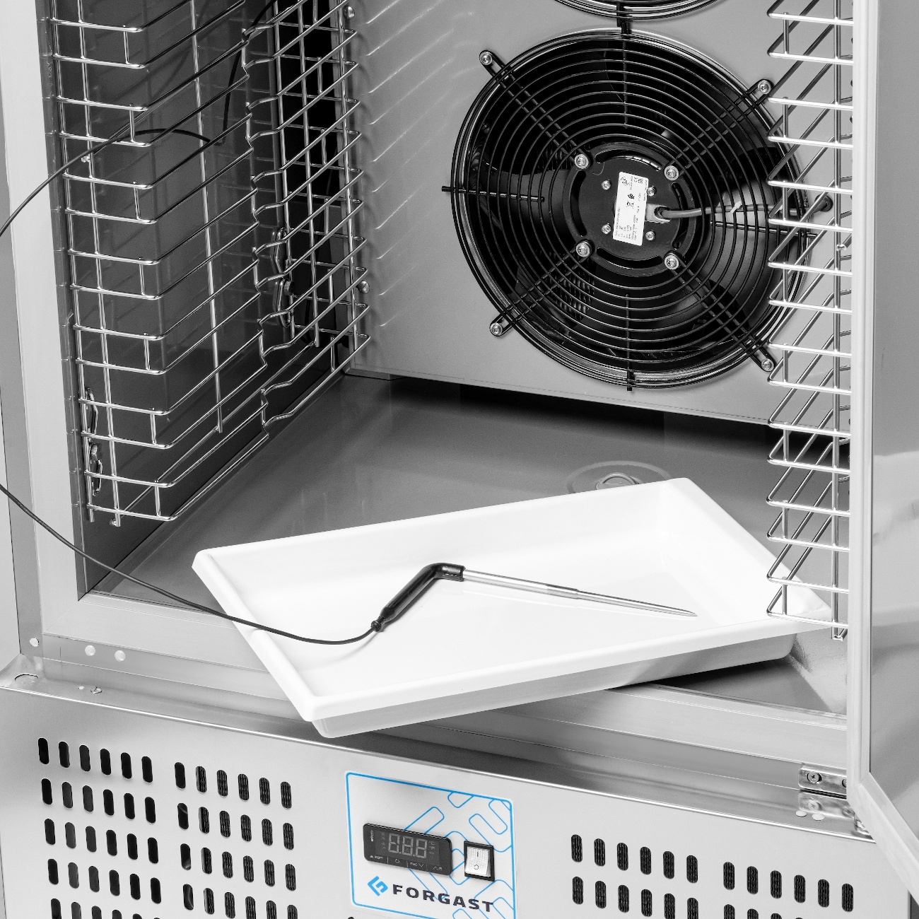 FORGAST FG07610V1 a fost proiectat pentru confortul utilizatorului și funcționalitate maximă. Camera aparatului poate găzdui până la 10 tăvi GN 1/1, permițând pregătirea simultană a mai multor loturi de produse – atât preparate gata de servit, cât și semifabricate care necesită răcire sau congelare rapidă. Ușa din oțel inoxidabil este echipată cu un mâner lung și comod, iar închiderea automată sub un unghi de 90° sporește confortul și reduce pierderile inutile de energie.