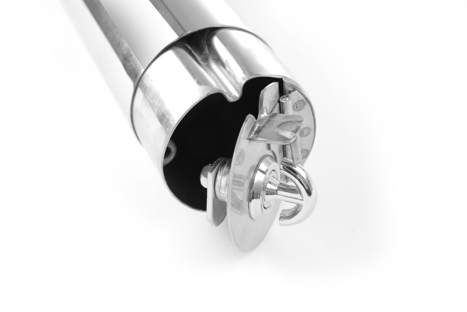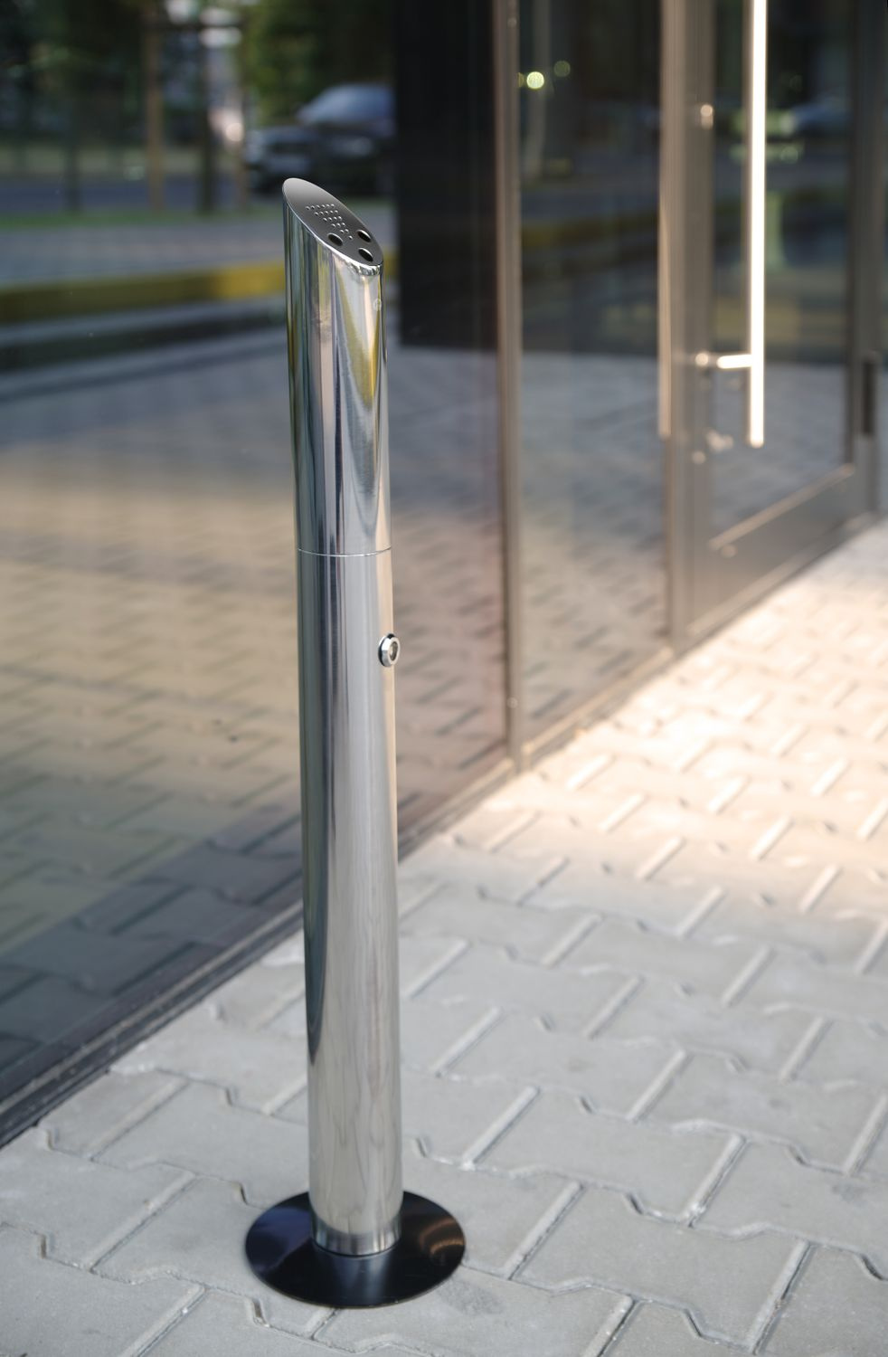 Scrumieră de podea. Construcție solidă, independentă, cu posibilitatea de fixare pe podea. Golirea scrumierii este ușoară datorită părții superioare care se deschide, închisă cu ajutorul unei chei.