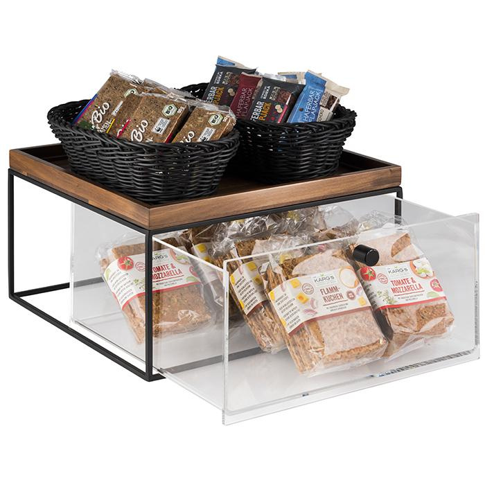 Acest sertar pentru pâine este perfect pentru utilizare zilnică în bucătărie, sufragerie sau la bufetul de mic dejun din hoteluri și restaurante. Construcția bine gândită include un suport stabil din metal, un sertar spațios cu mâner confortabil și un blat de tăiere din lemn de nuc uleiat. Tava detașabilă permite îndepărtarea rapidă a firimiturilor și menținerea curățeniei.