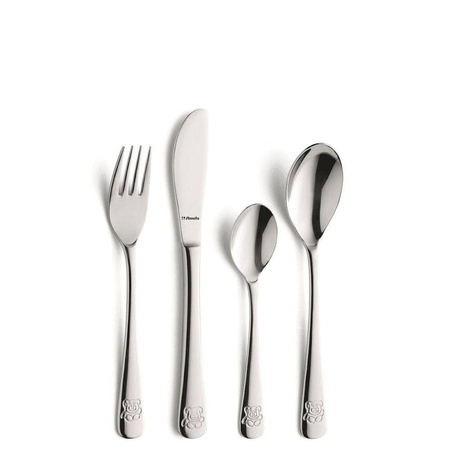 set de tacâmuri pentru copii din 4 piese din linia Teddy Bear de la Amefa din oțel inoxidabil 18/10. Gama de tacâmuri Teddy Bear este realizată cu atenție la detalii și este dimensionată pentru a se potrivi mâinilor mici, ceea ce o face perfectă pentru grădinițe. Fiecare piesă are o gravură cu un design de ursuleț de pluș. Tacâmuri cu margini netezite. Setul include: