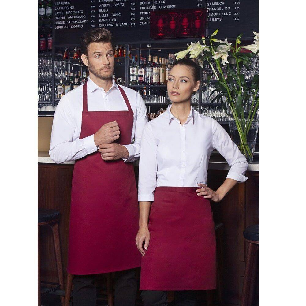Șorț de bucătar basic marca Karlowsky. Culoare bordo. Realizat din 65% poliester / 35% bumbac. Țesătură diagonală. Dimensiune 75x100 cm. Banda de la gât realizată din același material ca șorțul, cu o lungime de aprox. 60 cm. Potrivit pentru spălare la mașină și curățare uscată. Poate fi călcat.