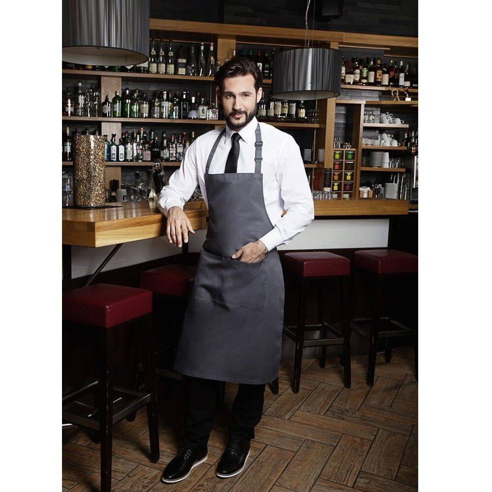 Șorț de bucătar basic marca Karlowsky. Culoare antracit. Realizat din 65% poliester / 35% bumbac. Țesătură diagonală. Dimensiune 75x90 cm. Șorț cu bretele realizate din materialul șorțului, cu puncte de tensiune întărite - bretea pentru gât cu cataramă pentru reglarea lungimii aprox. 70 cm - buzunar aplicat cu 2 compartimente (40 x 20 cm). Potrivit pentru spălare la mașină și curățare chimică. Se poate călca.