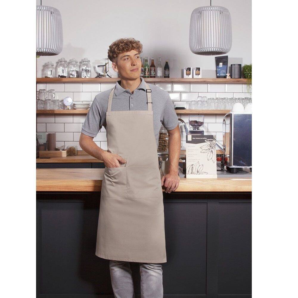 Șorț de bucătar basic marca Karlowsky. Culoare nisip. Realizat din 65% poliester / 35% bumbac. Țesătură diagonală. Dimensiune 75x90 cm. Șorț cu bretele confecționate din același material ca șorțul, cu puncte de tensionare întărite - bretea la gât cu cataramă pentru reglarea lungimii aprox. 70 cm - buzunar cusut cu 2 compartimente (40 x 20 cm). Potrivit pentru spălare la mașină și curățare chimică. Poate fi călcat.