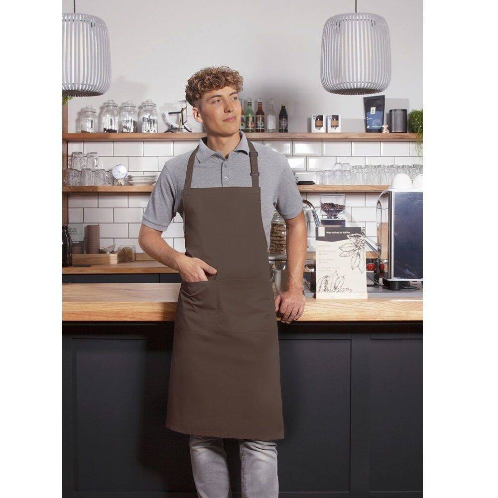Șorț de bucătar basic marca Karlowsky. Culoare maro deschis. Realizat din 65% poliester / 35% bumbac. Țesătură diagonală. Dimensiune 75x90 cm. Șorț cu bretele realizate din același material ca și șorțul, cu puncte de tensiune întărite - bretea pentru gât cu cataramă pentru reglarea lungimii aprox. 70 cm - buzunar aplicat cu 2 compartimente (40 x 20 cm). Potrivit pentru spălat la mașină și curățare chimică. Poate fi călcat cu fierul de călcat.