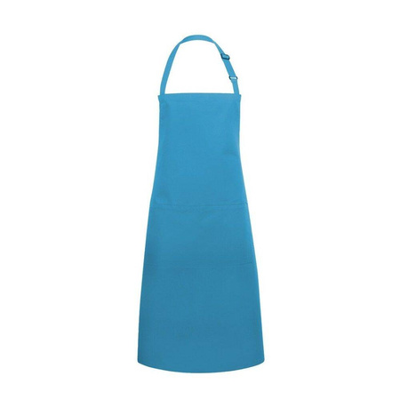 Șorț de bucătar basic marca Karlowsky. Culoare turcoaz. Realizat din 65% poliester / 35% bumbac. Țesătură diagonală. Dimensiuni 75x90 cm. Șorț cu curele realizate din materialul șorțului, cu puncte de tensionare întărite – curea de gât cu cataramă pentru reglarea lungimii de aprox. 70 cm – buzunar aplicat cu 2 compartimente (40 x 20 cm). Potrivit pentru spălare la mașina de spălat și curățare chimică. Poate fi călcat.