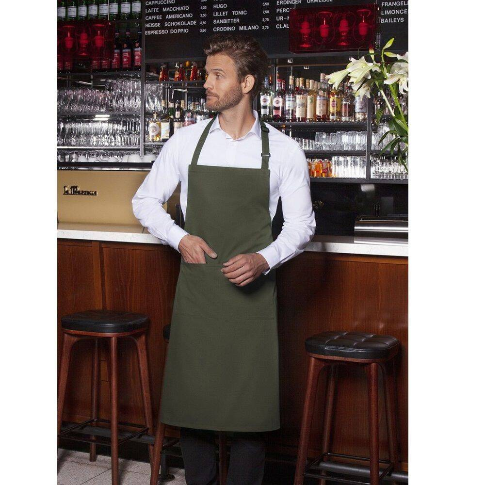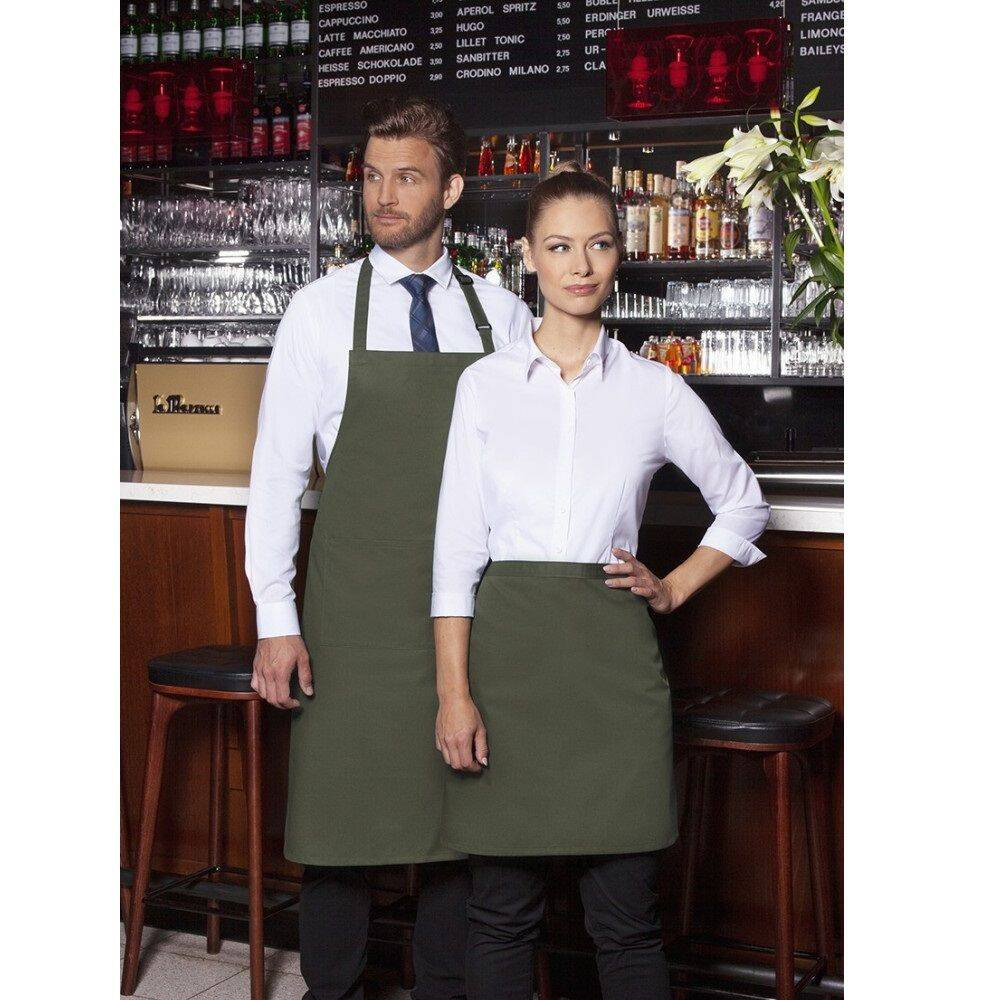 Șorț de bucătar basic marca Karlowsky. Culoare verde mușchi. Fabricat din 65% poliester / 35% bumbac. Țesătură diagonală. Dimensiuni 75x90 cm. Șorț cu bretele realizate din materialul șorțului, cu puncte de tensiune întărite – bretea pentru gât cu cataramă pentru reglarea lungimii de aprox. 70 cm – buzunar aplicat cu 2 compartimente (40 x 20 cm). Potrivit pentru spălare la mașină și curățare chimică. Potrivit pentru călcat.