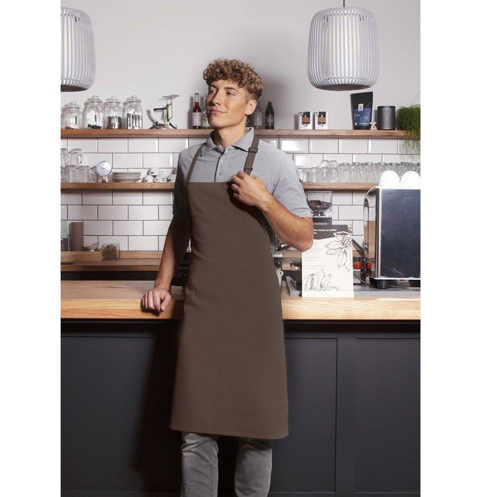 Șorț de bucătar basic marca Karlowsky. Culoare maro deschis. Realizat din 65% poliester / 35% bumbac. Țesătură diagonală. Dimensiune 75x90 cm. Șorț cu bretele realizate din același material ca șorțul, cu puncte de tensionare întărite – bretea la gât cu cataramă pentru reglarea lungimii de aprox. 70 cm. Potrivit pentru spălare la mașină și curățare chimică. Potrivit pentru călcat.
