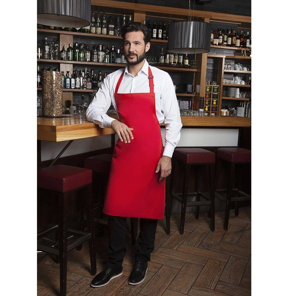 Șorț de bucătar basic marca Karlowsky. Culoare roșie. Realizat din 65% poliester / 35% bumbac. Țesătură diagonală. Dimensiuni 75x90 cm. Șorț cu șnururi realizate din același material ca șorțul, cu puncte de tensiune întărite – bretea pentru gât cu cataramă pentru reglarea lungimii de aprox. 70 cm. Poate fi spălat la mașină și curățat chimic. Potrivit pentru călcare.