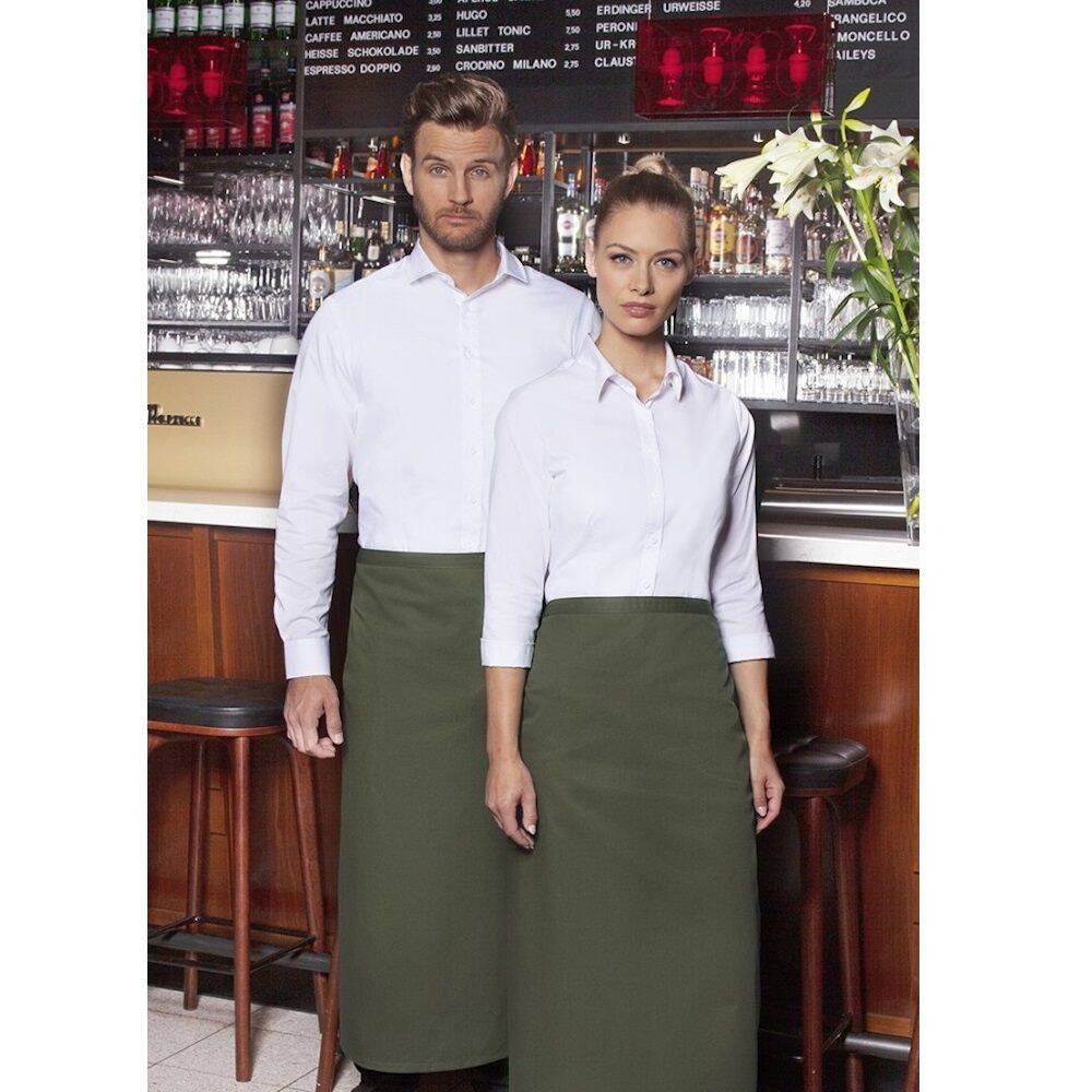 Șorț de chelner bistro basic de la Karlowsky. Culoare verde mușchi. Realizat din 65% poliester și 35% bumbac. Țesătură diagonală. Dimensiune 100x75 cm. Potrivit pentru spălare la mașină și curățare chimică. Poate fi călcat.