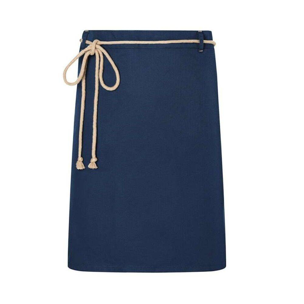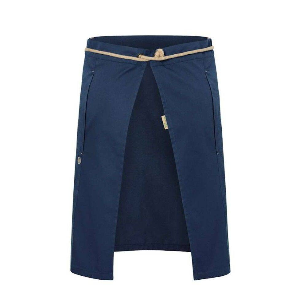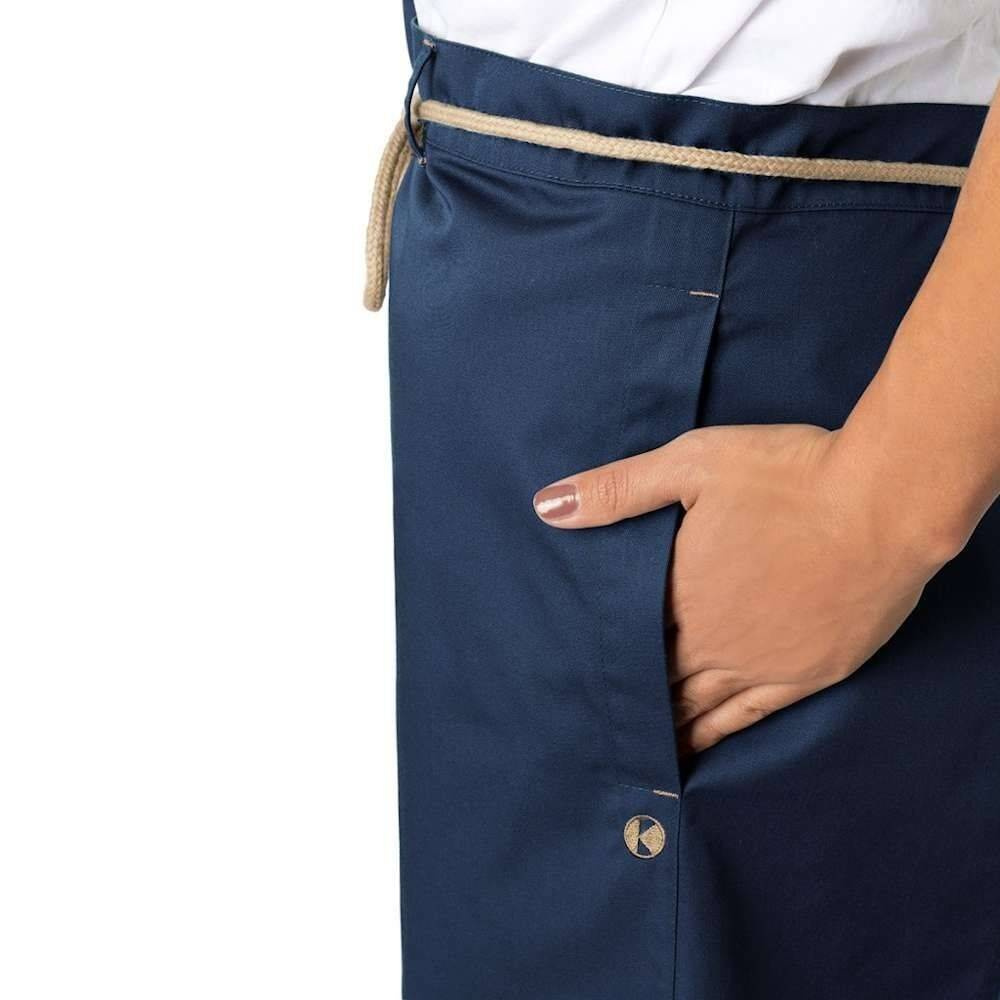 Fabricat dintr-un amestec de bumbac 35% și poliester 65% obținut din reciclare. Ecologic. Țesătură modernă, diagonală. Culoare albastră durabilă și ușor de curățat. Buzunare laterale care facilitează accesul la buzunarele proprii ale pantalonilor. Cordonul este realizat din șnururi contrastante. Cusăturile de pe paspoaluri și buzunare accentuează aspectul și stilul natural al șorțului.