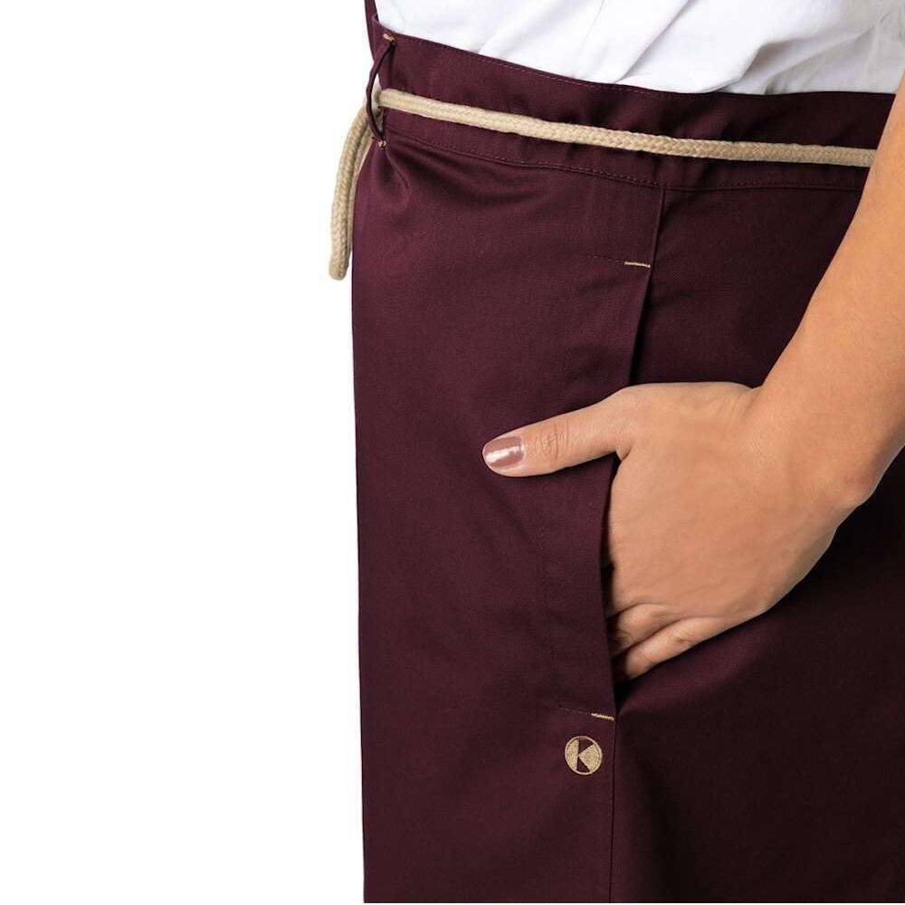 Realizat dintr-un amestec de bumbac 35% și poliester 65% obținut prin reciclare. Ecologic. Țesătură modernă în diagonală. Culoare rezistentă și ușor de curățat – vinete. Buzunare laterale pentru acces facil la buzunarele proprii ale pantalonilor. Cureaua este realizată din șnururi în contrast. Cusăturile de pe gaici și buzunare accentuează aspectul natural și stilul șorțului.