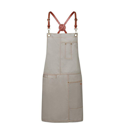 Șorț Urban X-Style marca Karlowsky.  Fabricat 100% din bumbac. Culoare gri bazalt. Dimensiuni 68 x 80 cm. Curelele din piele ale șorțului, încrucișate pe spate, reduc presiunea asupra gâtului, iar prinderea și desprinderea ușoară sunt asigurate de carabiniere. Lungimea curelelor poate fi reglată cu ajutorul cataramelor, iar lățimea în talie printr-o curea suplimentară la brâu. Nituri maro și cusături contrastante oferă un stil urban unic. Șorțul are suplimentar un buzunar aplicat pe partea stângă, cu un compartiment pentru pixuri (dim. 16 x 24 cm). Se poate spăla la o temperatură de până la 60 ° C. Nu se folosește înălbitor. Se calcă la o temperatură de până la 150 ° C.