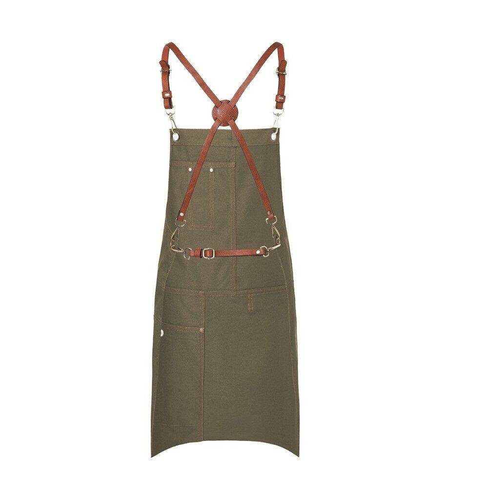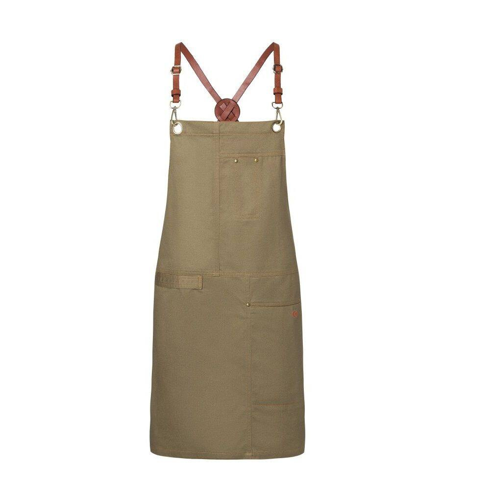 Șorț Urban X-Style marca Karlowsky.  Fabricat 100% din bumbac. Culoare kaki. Dimensiuni 68 x 80 cm. Curelele din piele ale șorțului sunt încrucișate pe spate pentru a reduce presiunea asupra gâtului, iar carabinierele permit o fixare și îndepărtare ușoară. Lungimea curelelor poate fi reglată cu ajutorul cataramelor, iar lățimea în talie printr-o curea suplimentară în talie. Nituri maro și cusături contrastante oferă un stil urban unic. Șorțul are, de asemenea, un buzunar cusut pe partea stângă cu un compartiment pentru pixuri (dim. 16 x 24 cm). Se poate spăla la max. 60 °C. Nu se albeste. Se poate călca la max. 150 °C.