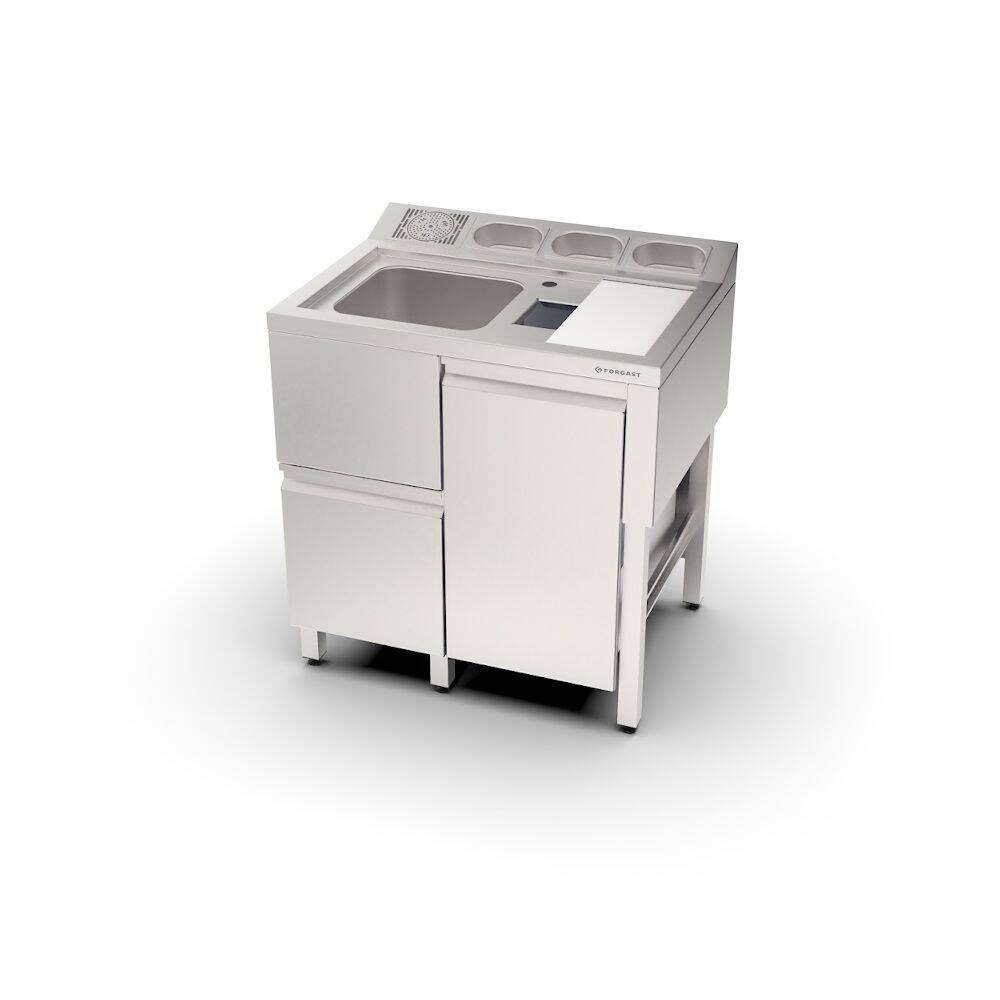 Stația de barman FORGAST FG15414 este proiectată pentru funcționalitate maximă. Are o chiuvetă spațioasă cu un vas adânc de 20 cm pentru spălarea confortabilă a vaselor mari. Sub chiuvetă, există sertare practice pentru micile accesorii de barman, iar coșul de gunoi detașabil facilitează semnificativ păstrarea curățeniei în timpul lucrului. Setul include un stropitor pentru curățarea rapidă a paharelor și trei recipiente GN 1/9, care pot fi utilizate pentru diverse aditivi, fructe sau condimente. Masă pregătitoare cu placă de tăiere din PVC pentru prelucrarea eficientă și igienică a ingredientelor.