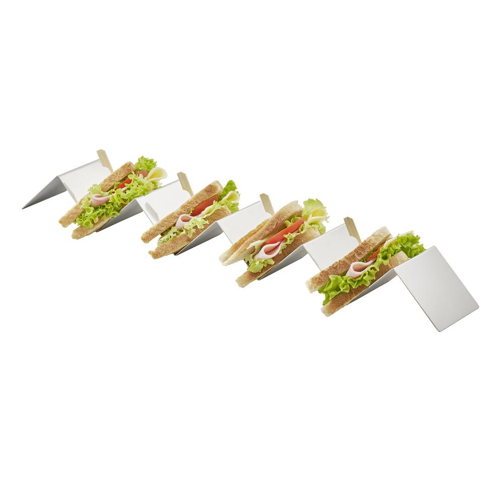 Suportul este alcătuit dintr-o singură piesă din oțel inoxidabil, prevăzută cu patru compartimente profilate. Fiecare compartiment asigură susținerea stabilă a sandwich-urilor sau burgerilor, prevenind răsturnarea acestora. Forma simplă și minimalistă face ca suportul să fie ușor de curățat și să nu ocupe mult spațiu pe masă sau pe tejgheaua bufetului.