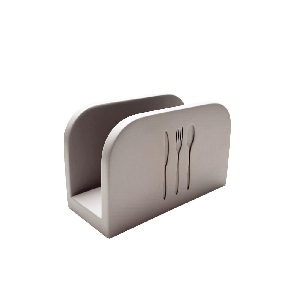 Produsul este realizat în întregime din beton, ceea ce îl face extrem de solid și rezistent la deteriorări. Forma geometrică simplă și culoarea neutră îi subliniază universalitatea. Partea de jos a suportului a fost concepută pentru a proteja suprafața mesei împotriva zgârieturilor. Deschiderea largă permite introducerea și scoaterea ușoară a șervețelelor.
