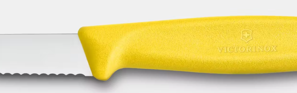Cuțit zimțat pentru legume și fructe cu mâner portocaliu de la Victorinox. Ideal pentru felierea legumelor și fructelor moi, de ex. roșii. De asemenea, funcționează bine ca un cuțit de masă. Lama zimțată lungă de 11 cm a fost fabricată din oțel inoxidabil laminat pentru o rezistență sporită, astfel încât cuțitul să rămână ascuțit pentru o perioadă lungă de timp. Mâner de cuțit din polipropilenă portocalie. Forma ergonomică a mânerului face ca cuțitul să stea bine în mână, ceea ce îmbunătățește confortul de lucru. Lungimea totală a cuțitului este de 22 cm. Cuțitul poate fi spălat în mașina de spălat vase.