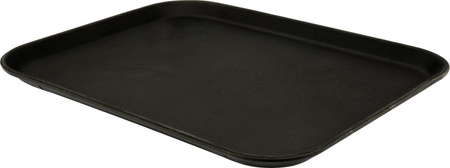 Tavă de servire antiderapantă, dreptunghiulară, cu dimensiunile de 46x35,5 cm. Culoare neagră. Fibra de sticlă multistratificată folosită la fabricarea tăvii garantează o rigiditate mare și o rezistență mecanică ridicată. Tava are margini care protejează produsele împotriva căderii. Tava este ideală pentru utilizare în hoteluri, restaurante și baruri.