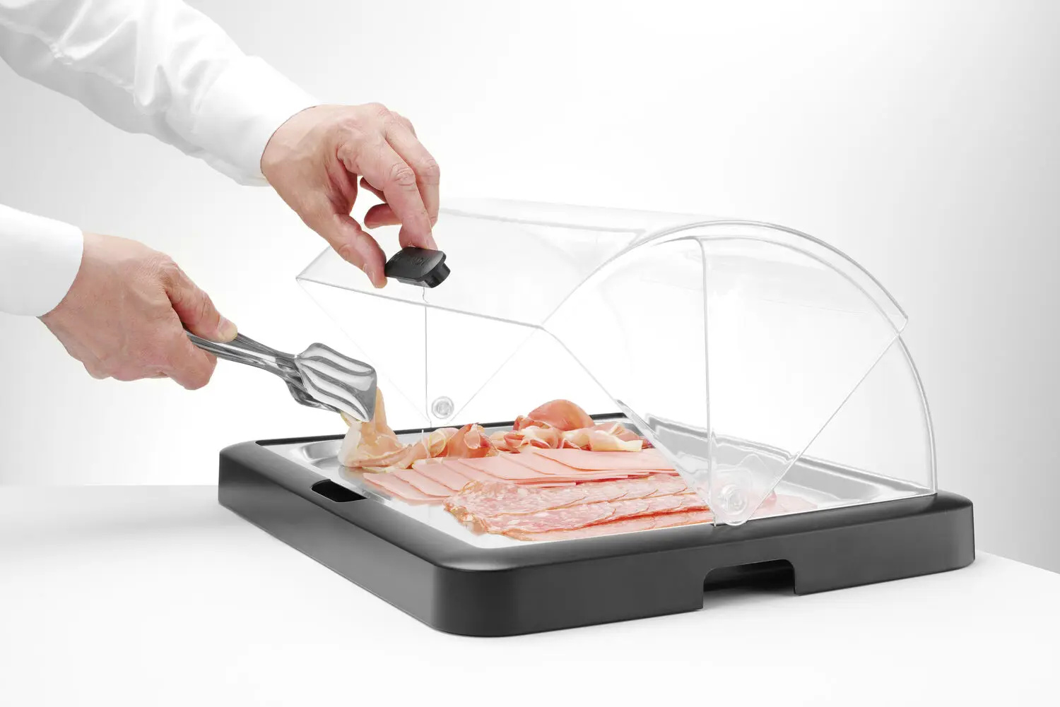 - Funcționalitate ridicată – capacul transparent din PET permite alegerea preparatelor fără ridicarea acestuia, iar mânerul și decupajele speciale din carcasă facilitează utilizarea,