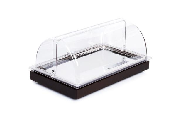 Construcția tăvii a fost concepută special pentru utilizare intensivă în gastronomie. Oțelul inoxidabil 18/10 oferă rezistență deosebită și ușurință la curățare, iar elementele din lemn conferă un caracter elegant. Capacul roll-top permite accesul rapid la preparate fără a fi nevoie să fie îndepărtat complet, sporind igiena și confortul în utilizare. Capacul transparent permite controlul conținutului în orice moment, iar forma dreptunghiulară facilitează aranjarea tăvii împreună cu alte elemente ale bufetului.