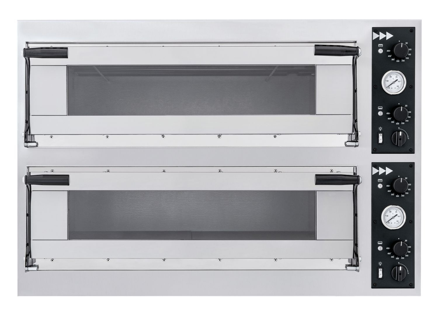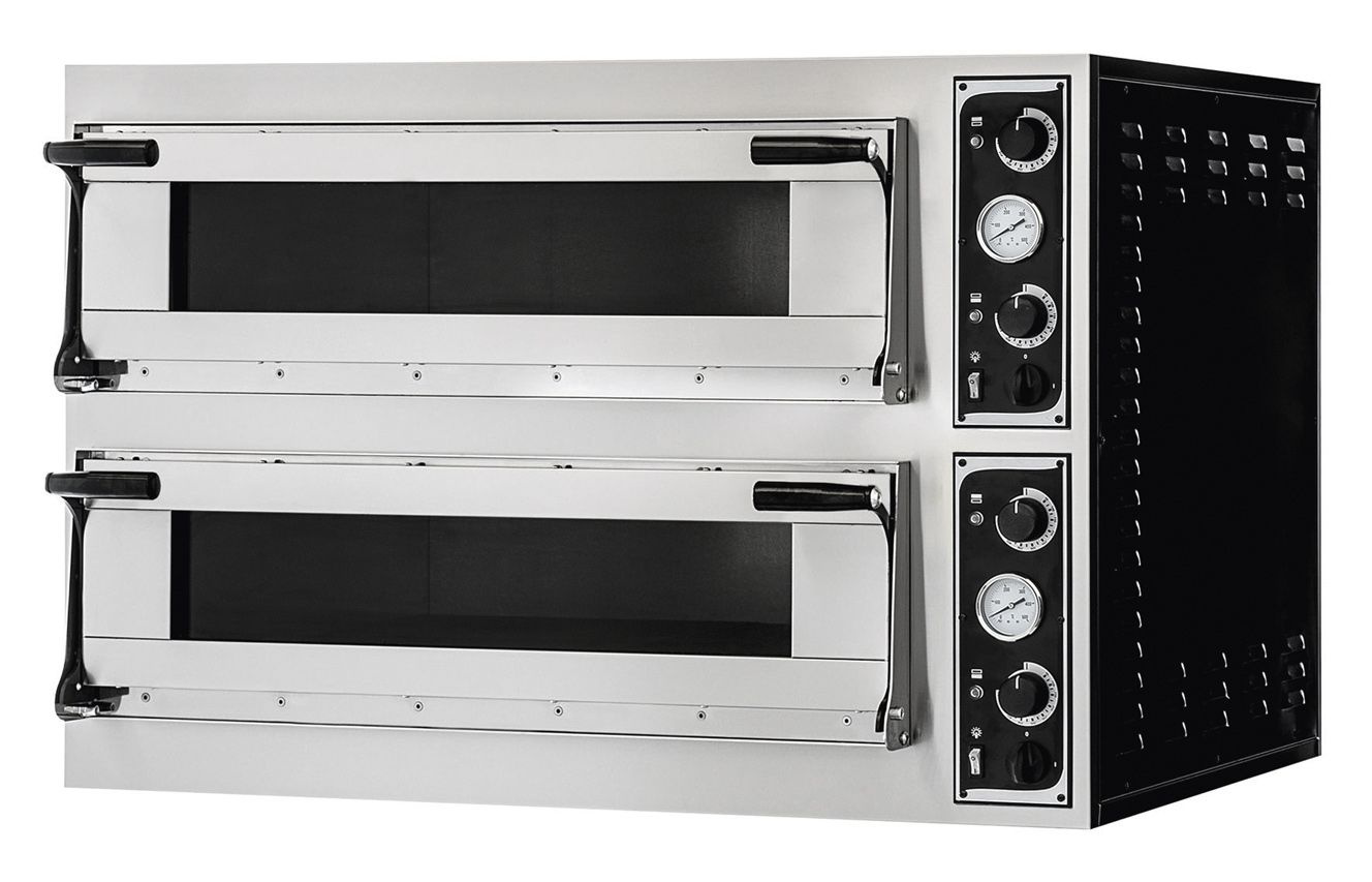 Caracteristici principale: -Utilizare versatilă - camera mare permite coacerea de pizza, pâine, prăjituri și alte produse de patiserie. -Construcție robustă - față din oțel inoxidabil, carcasă vopsită în negru pentru durabilitate și rezistență la utilizare intensivă. -Ușă vitrată - o fereastră mare în ușă vă permite să observați în mod convenabil procesul de gătit fără a fi nevoie să deschideți ușa. -Mânere duble - fiecare ușă este echipată cu două mânere ergonomice pentru o utilizare mai ușoară. -Izolație eficientă - vata minerală minimizează eficient pierderile de căldură și îmbunătățește eficiența energetică. -Control precis al temperaturii - interval de la 45°C la 455°C cu control independent al temperaturii pentru părțile superioară și inferioară ale camerei. -Elemente de încălzire puternice - fiecare compartiment este echipat cu 6 elemente de încălzire (3 sus și 3 jos), care asigură încălzirea rapidă și gătitul uniform. -Control independent - control mecanic separat pentru fiecare cameră, permițând controlul complet al procesului de coacere. -Iluminarea camerelor - iluminarea independentă în fiecare cameră permite monitorizarea convenabilă a produselor de panificație.