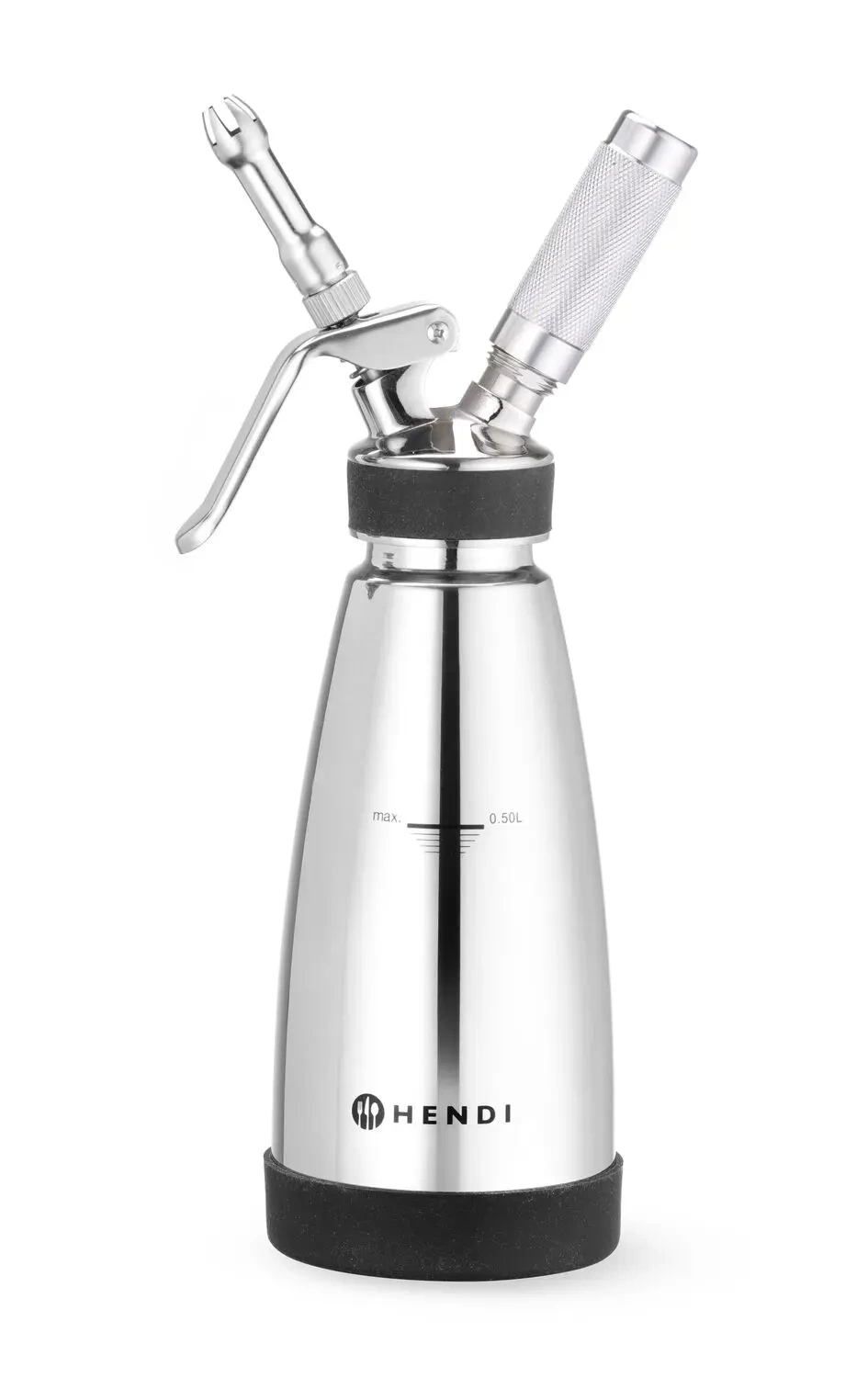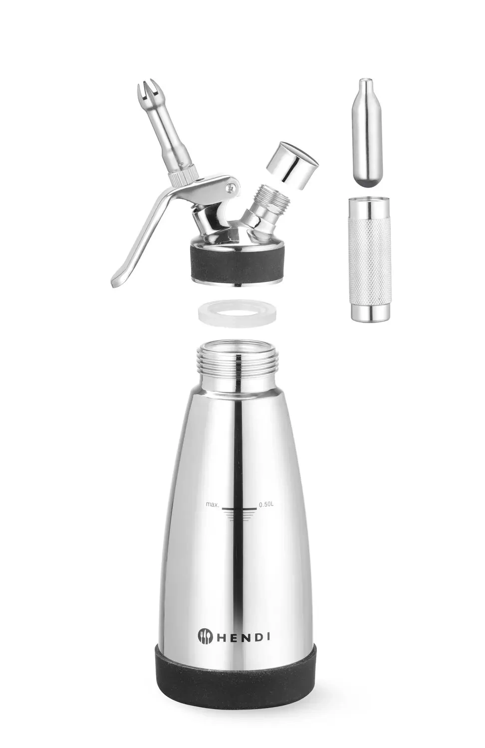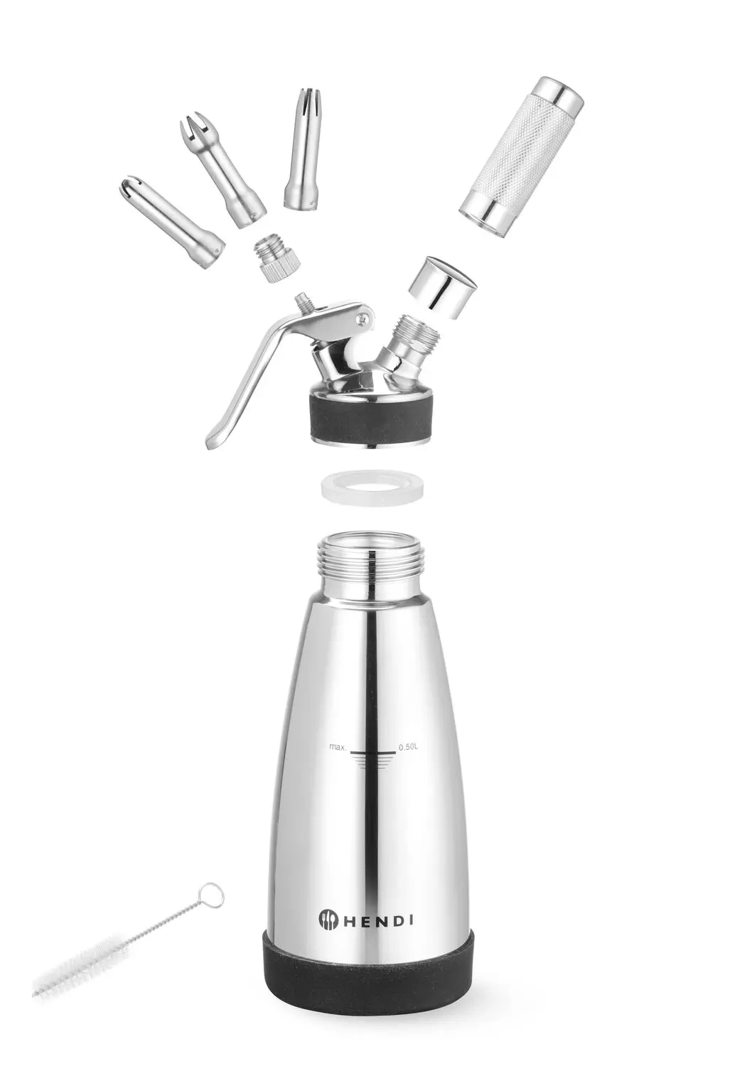 Dispozitivul este echipat cu o bază antiderapantă din silicon, care asigură stabilitate în timpul utilizării. Sifonul este compatibil cu capsulele de frișcă LISS și HENDI, permițând spumarea ușoară și eficientă a sosurilor. Setul include trei duze din oțel inoxidabil, un adaptor pentru gaz și o perie practică pentru curățare. Vă rugăm să rețineți că produsul nu este potrivit pentru spălarea în mașina de spălat vase.