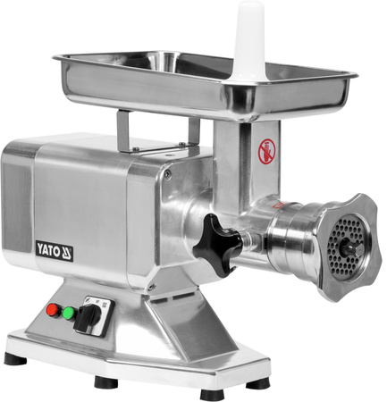 Mașină profesională de tocat carne (tocător) cu sistem UNGER marca YATO cu o capacitate aproximativă de 220 kg/oră. Carcasă din aluminiu anodizat. Gât detașabil. Cuțitul, râșnița, filtrele și tava de încărcare din oțel inoxidabil. Sistemul UNGER, care este deosebit de potrivit pentru prepararea cârnaților și a mezelurilor, constă din: un jerk, un cuțit de tăiere cu 4 brațe cu două fețe și un gât cu diametrul de 8 cm. Acționarea morii are o funcție de inversare, facilitând curățarea mașinii după utilizare. Tavă de încărcare detașabilă. Dispozitivul are protecție la suprasarcină. Baza a fost prevăzută cu 6 picioare de cauciuc pentru a preveni deplasarea unității în timpul funcționării.