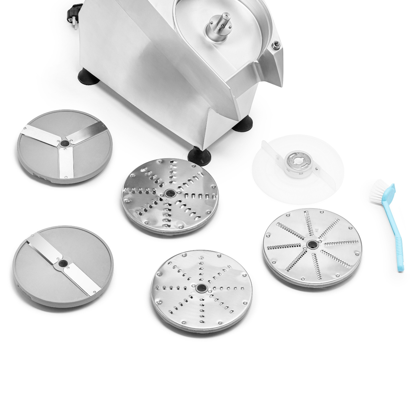 • Set complet de discuri inclus – discurile incluse permit tăierea legumelor în fâșii de 3 mm, 5 mm și 7 mm, precum și în felii de 2 mm și 4 mm, ceea ce oferă posibilitatea de a pregăti ingrediente pentru diverse preparate, de la salate până la gratinuri.