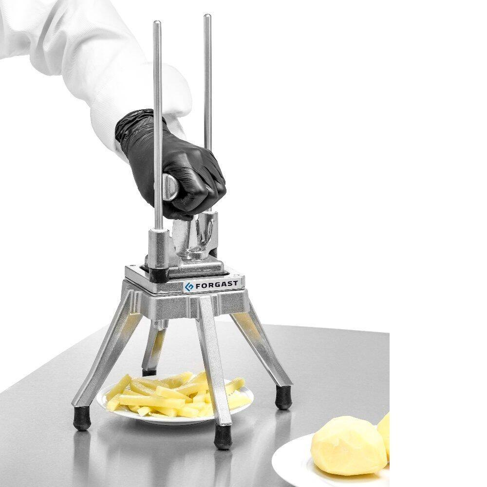 Tocătorul FORGAST FG10007 este un dispozitiv manual care nu necesită conectare la energie electrică, astfel încât poate fi folosit atât în bucătării profesionale, cât și în aer liber în timpul evenimentelor de catering. Dimensiunile sale compacte – 20 x 20 x 47 cm – permit amplasarea convenabilă chiar și pe spații de lucru mici și permit, de asemenea, servirea rapidă a unui număr mare de porții într-un timp scurt. Este potrivit atât pentru prepararea cartofilor pai, cât și pentru tăierea altor legume sau fructe în cuburi, de exemplu pentru salate, supe sau aperitive.