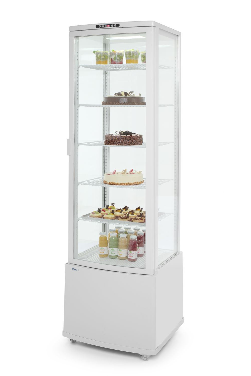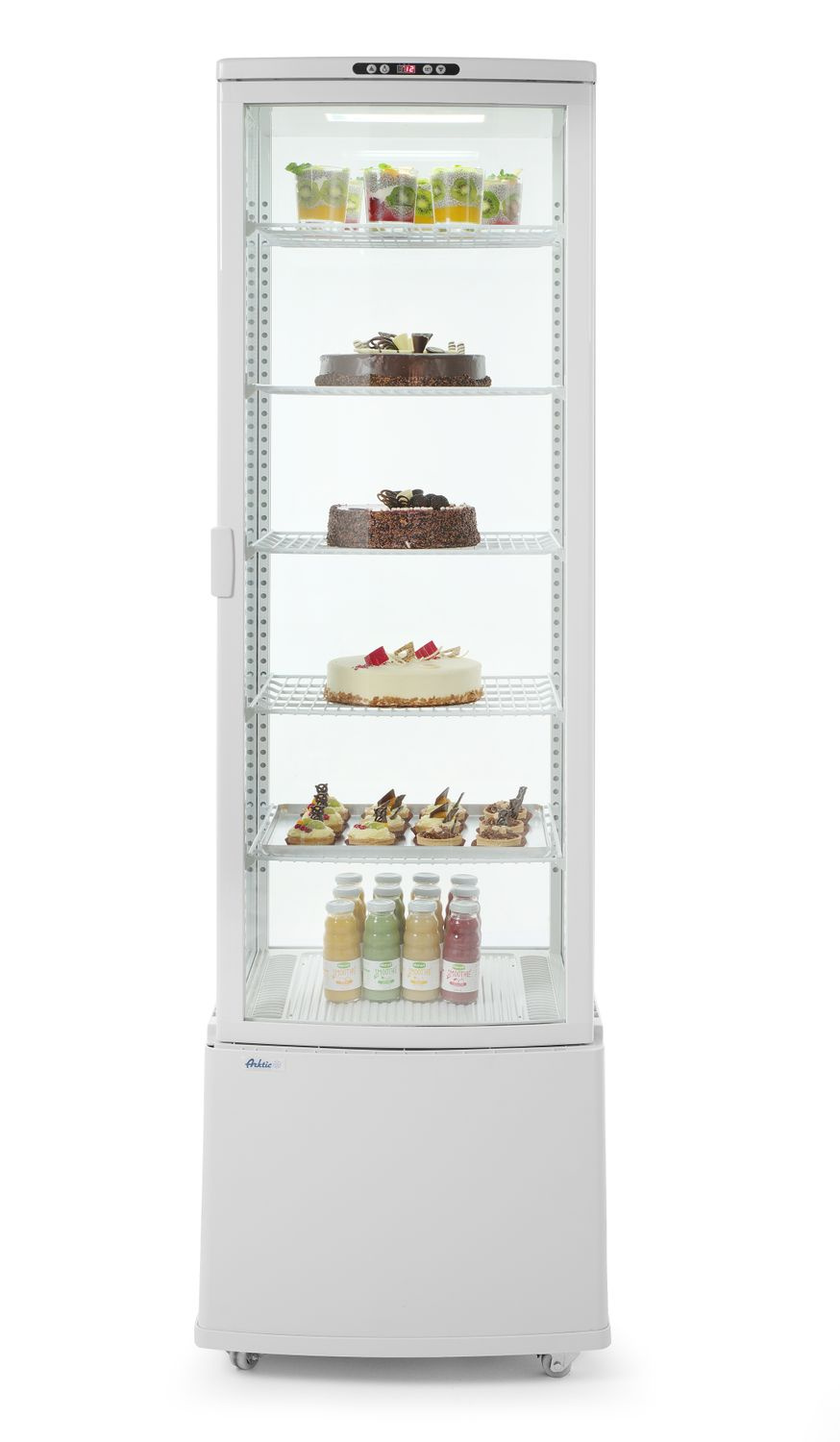 Vitrina frigorifică ARKTIC 233696 a fost proiectată pentru prezentarea convenabilă și depozitarea sigură a produselor alimentare, băuturilor, deserturilor sau lactatelor. Oțelul inoxidabil de înaltă calitate, vopsit în câmp electrostatic, asigură durabilitate și ușurință la curățare. Ușile curbate facilitează utilizarea zilnică, iar sistemul de ventilație bine gândit elimină eficient problema aburirii geamurilor, asigurând un aspect estetic al expunerii. Vitrina este echipată cu cinci rafturi reglabile care pot fi adaptate în funcție de necesități.