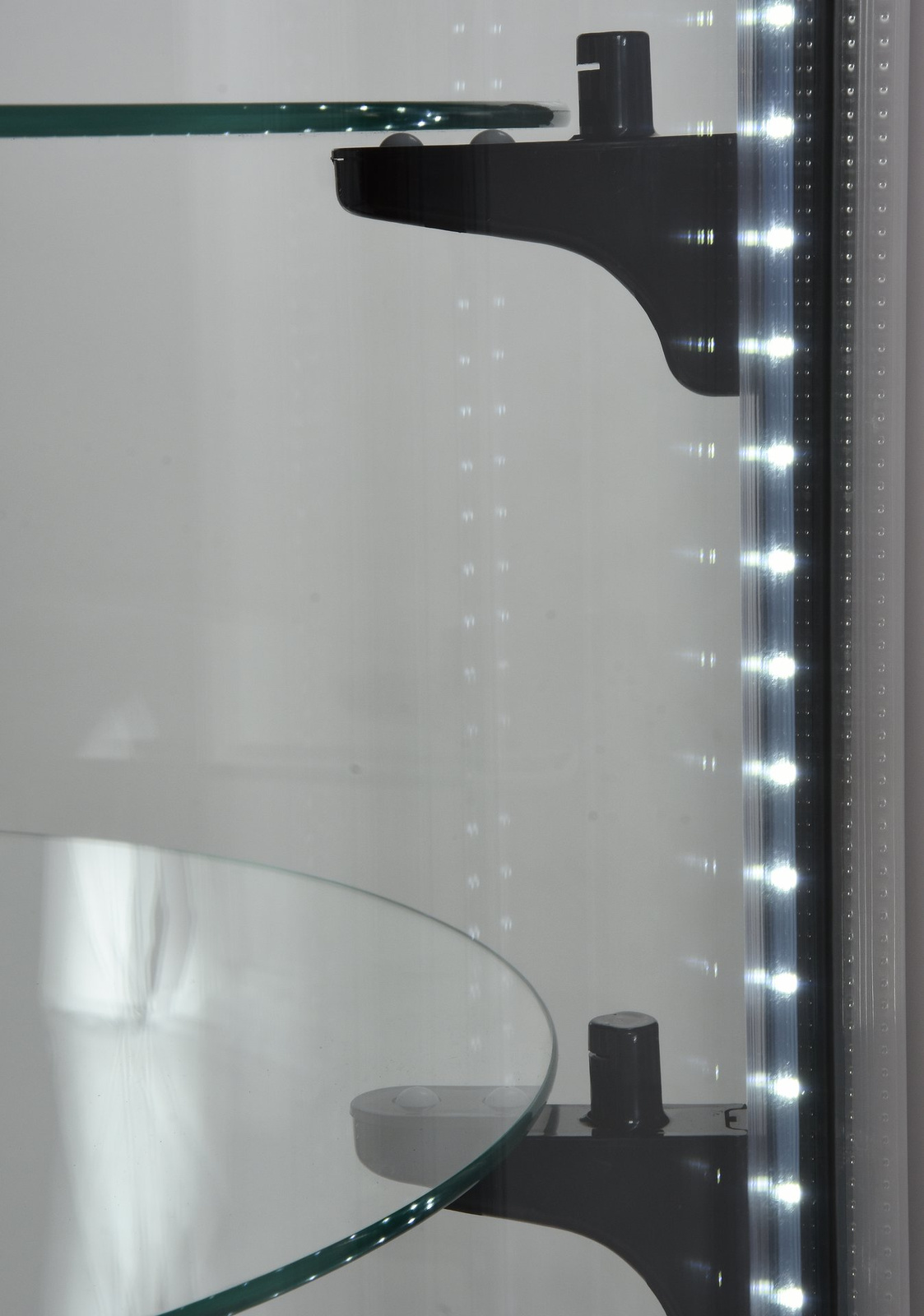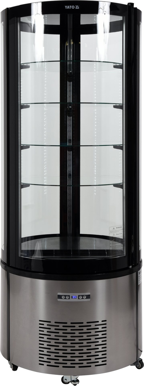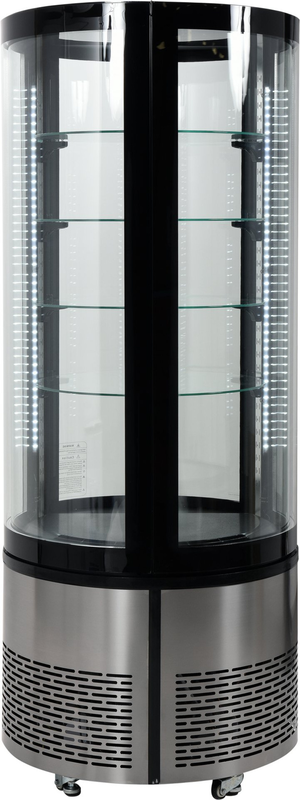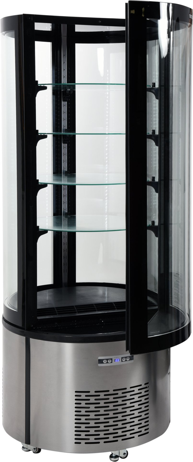 Vitrină frigorifică rotundă cu o capacitate de 400 litri. Fabricat din materii prime de înaltă calitate. Ideal pentru expunerea prăjiturilor și a produselor de patiserie. Dotat cu 4 rafturi din sticlă temperată reglabile pe înălțime. Accesul la interiorul vitrinei se face prin intermediul unei uși din sticlă călită cu funcție de închidere automată. Vitrina are iluminare LED. Răcitorul utilizează agentul frigorific R290. Unitatea are un controler electronic cu un afișaj digital al temperaturii. Unitatea de afișare are 4 picioare cu roți integrate - prin înșurubarea picioarelor, unitatea de afișare se așează pe roți, făcând posibilă mutarea oriunde. Cu toate acestea, în cazul în care picioarele sunt răsucite din loc, vitrina se așează ferm la sol și rămâne imobilizată.