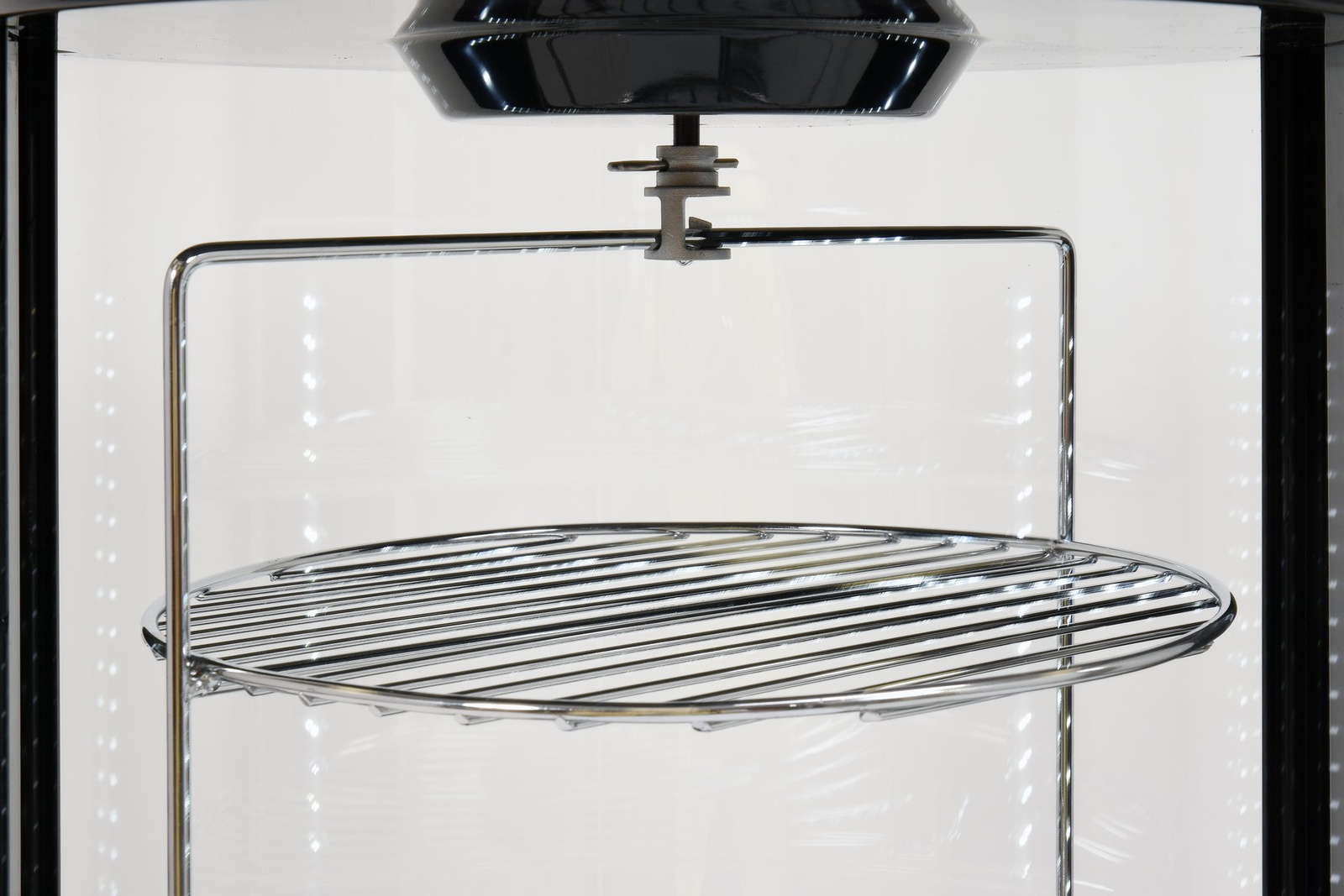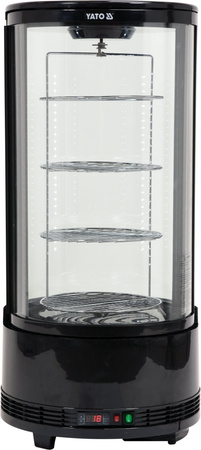 Vitrină frigorifică rotundă de banc cu o capacitate de 73 l. Culoare neagră. Fabricată din materii prime de înaltă calitate. Ideală pentru expunerea torturilor și prăjiturilor. Dotată cu 4 rafturi din sticlă securizată cu înălțime reglabilă. Accesul la interiorul vitrinei se face prin uși din sticlă securizată cu funcție de auto-închidere. Vitrina are iluminare LED pe ambele părți. Agregatul frigorific folosește agent frigorific 600a. Aparatul este echipat cu un controler electronic cu afișaj digital al temperaturii.