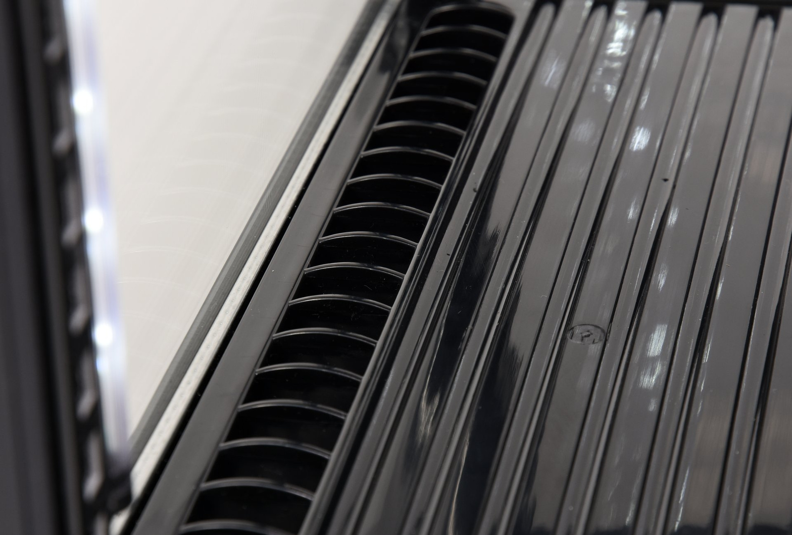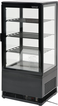 Vitrină frigorifică cu o capacitate de 78 l. Culoare neagră. Fabricată din materii prime de înaltă calitate. Ideală pentru expunerea produselor precum prăjituri, torturi, mini gustări sau diverse tipuri de smoothie. Echipată cu 3 rafturi întărite, acoperite cu PVC, cu înălțime reglabilă de montare. Accesul la interiorul vitrinei se face prin uși de sticlă realizate din geamuri securizate duble, la fel ca geamul frontal și cele laterale. Vitrina este prevăzută cu iluminare LED pe 2 laturi. Agregatul frigorific folosește agent frigorific R600a. Dispozitivul are un controler electronic cu afișaj digital al temperaturii.