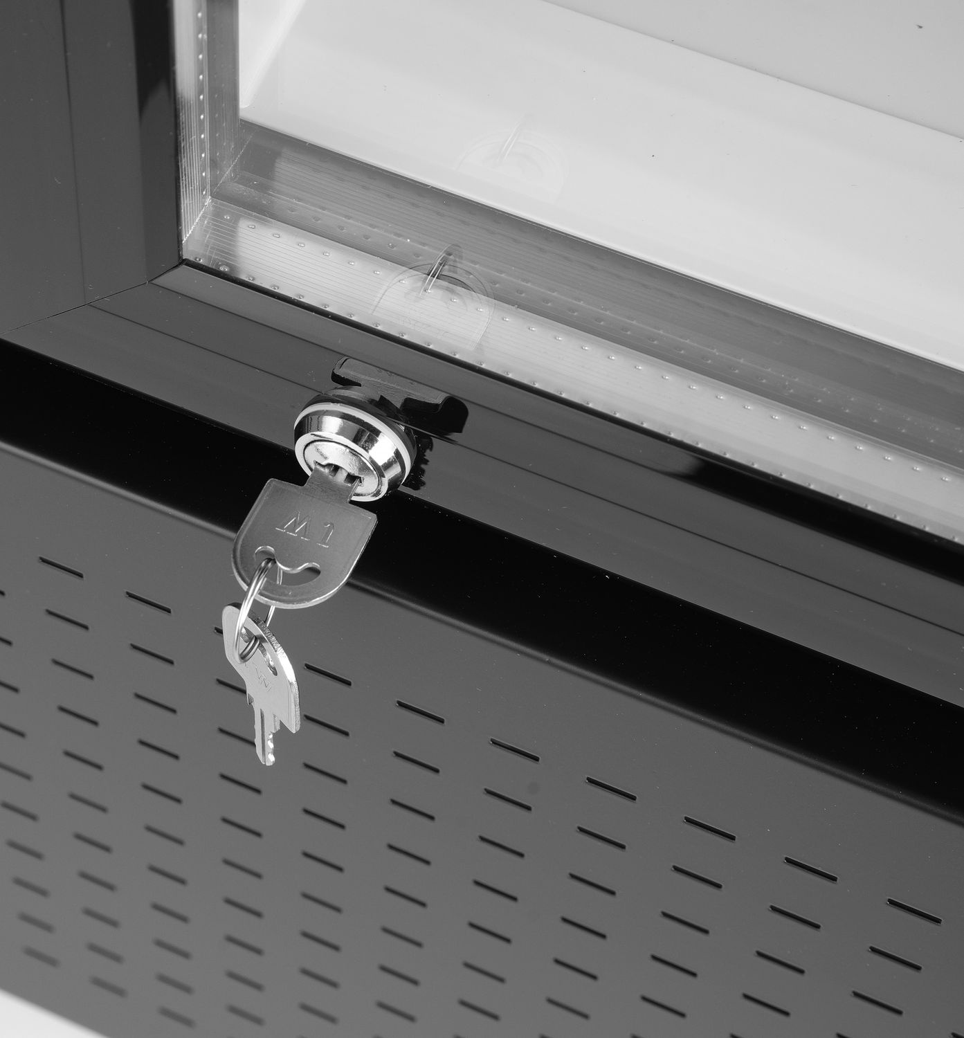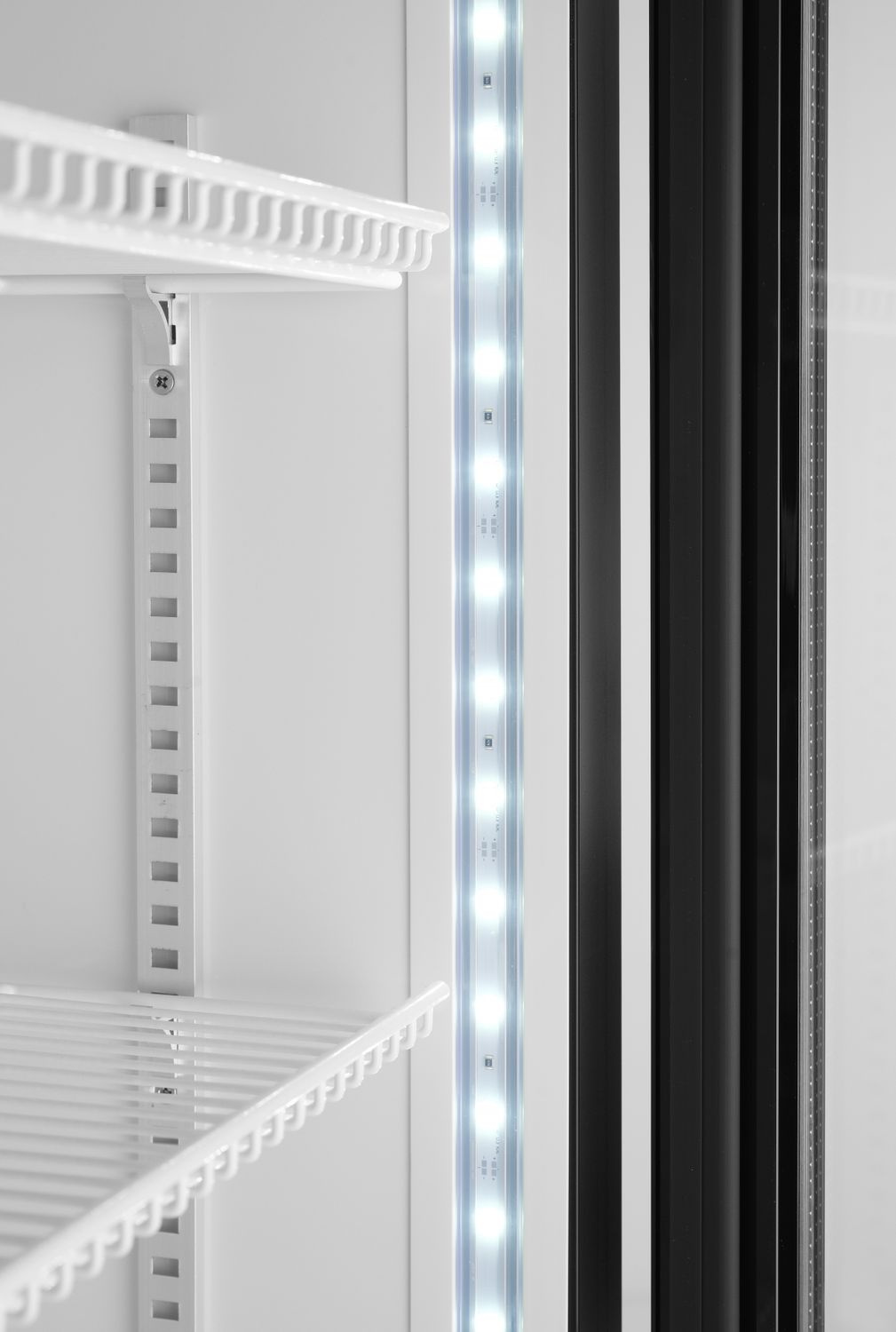 - Iluminare LED – montată atât în compartiment, cât și pe panoul superior, garantează vizibilitate excelentă a conținutului și a graficii prezentate.