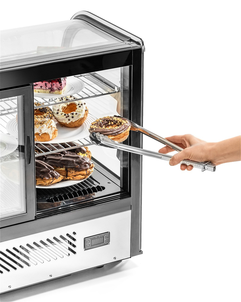 Vitrina Forgast FG07741 a fost proiectată cu accent pe funcționalitate maximă și estetică. Carcasa neagră, stilată, se integrează perfect atât în interioare moderne, cât și clasice ale unităților gastronomice. Datorită pereților laterali din sticlă și iluminării LED eficiente energetic, produsele sunt expuse într-un mod care atrage atenția clienților. Sistemul dinamic de răcire cu circulație forțată a aerului asigură o temperatură constantă la toate nivelurile vitrinei, astfel încât chiar și produsele plasate pe rafturile superioare își păstrează prospețimea. Vitrina este ideală pentru cofetării pentru prezentarea torturilor și prăjiturilor, în cafenele pentru expunerea sandvișurilor și deserturilor sau în restaurante pentru răcirea băuturilor și aperitivelor.