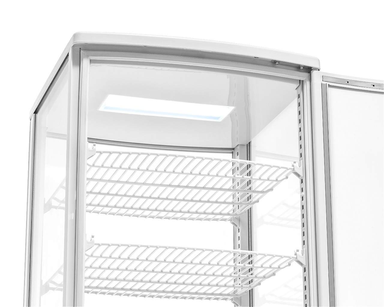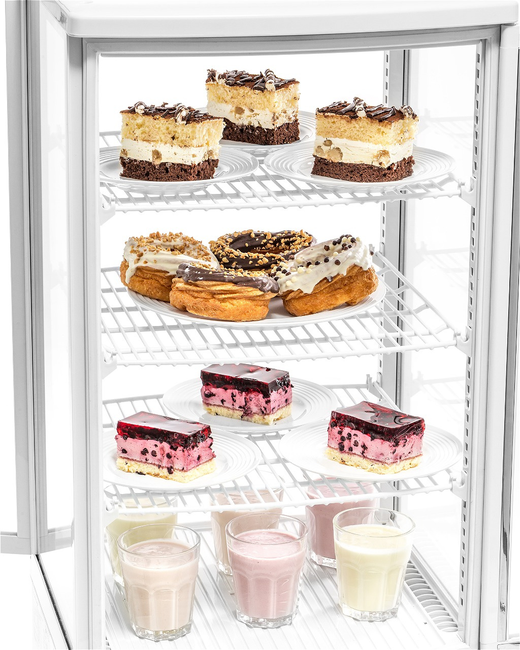Dispozitivul este echipat cu patru rafturi din grătar cu înălțime reglabilă, ceea ce permite adaptarea flexibilă a spațiului la nevoile curente – pe ele pot fi așezate atât torturi înalte, cât și gustări joase. Iluminarea LED din interior evidențiază prospețimea și culorile produselor, atrăgând atenția clienților. Ușile cu deschidere bilaterală sporesc confortul utilizării și permit completarea rapidă a stocului fără a fi nevoie de mutarea dispozitivului. Sistemul dinamic de răcire și dezghețarea automată reduc necesitatea intervenției personalului și asigură stabilitatea condițiilor de păstrare. Setul include un set de rafturi și manual de utilizare.