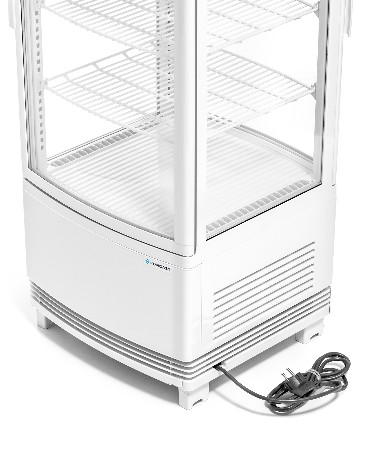 Vitrina FORGAST FG07758 a fost proiectată pentru prezentarea comodă și estetică a produselor alimentare. Carcasa sa modernă, albă, se integrează perfect în diverse aranjamente interioare, de la clasice la moderne. Vitrarea pe patru laturi permite expunerea produselor din orice direcție, aspect deosebit de important în cofetării, cafenele sau bufete hoteliere, unde este esențială interacțiunea rapidă a clientului cu oferta prezentată. Vitrina este potrivită și pentru magazine alimentare pentru expunerea salatelor, deserturilor, sandwich-urilor sau băuturilor.